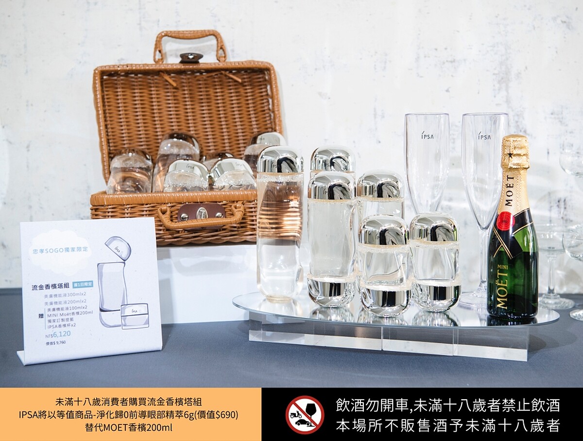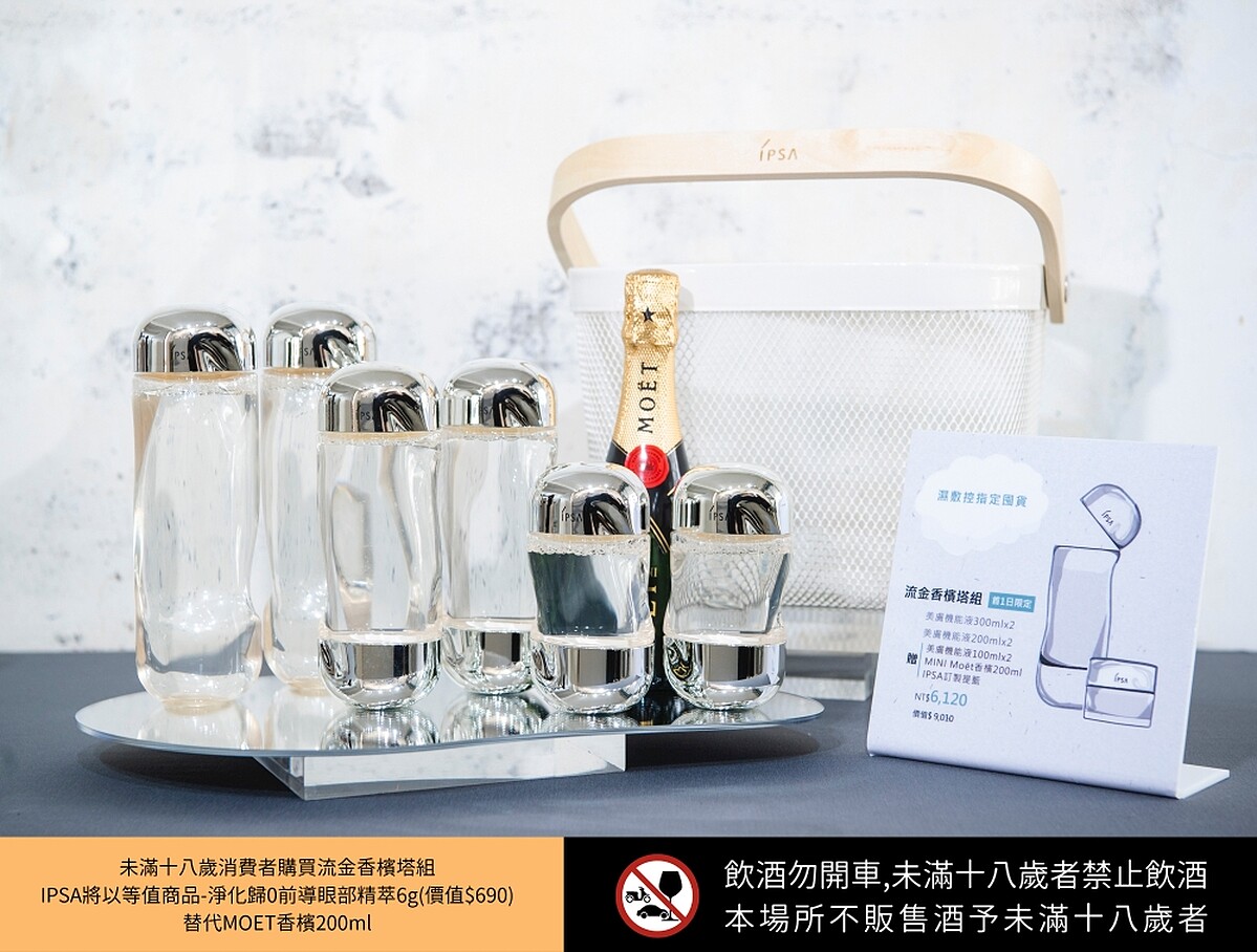 內容:購買美膚機能液300ml*2+美膚機能液200ml*2,贈美膚機能液100ml*2+Moet香檳100ml+獨家訂製提籃+IPSA香檳杯*2。