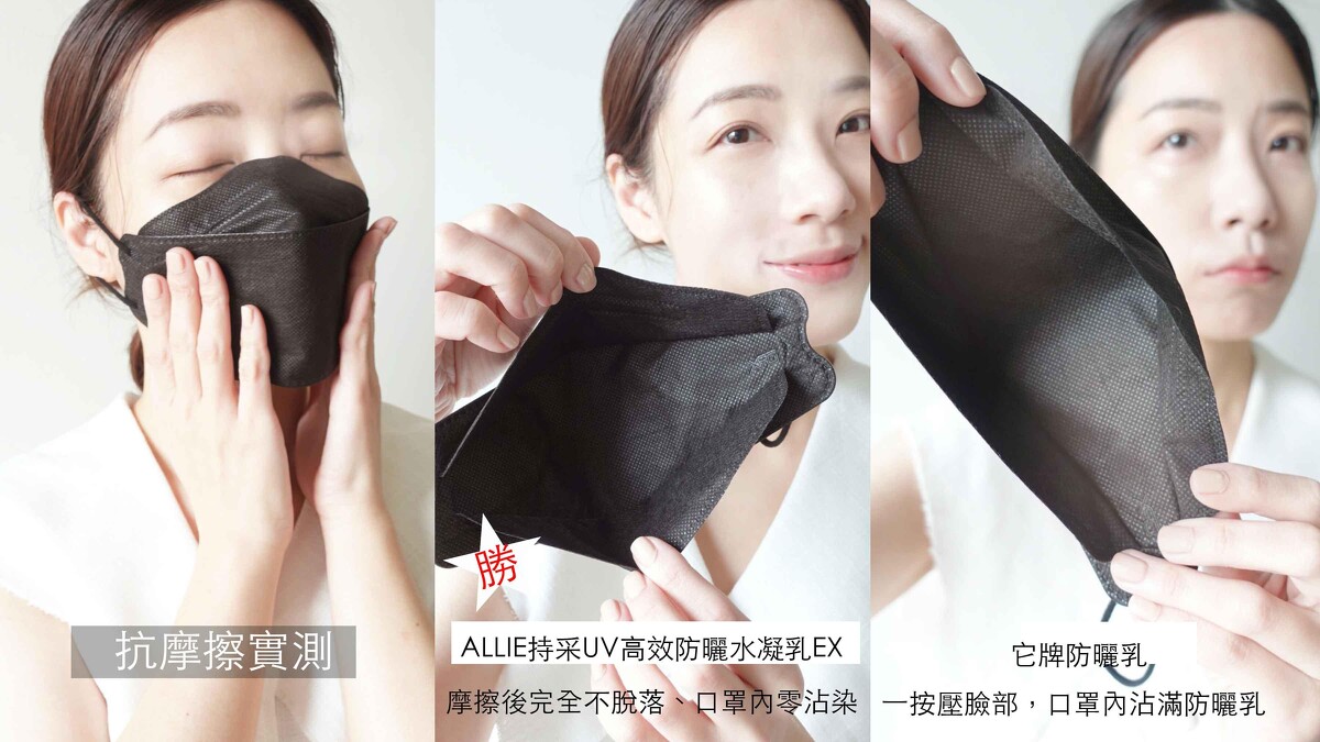 超殘酷的摩擦實測有圖有真相!黑色口罩完全見證抗摩擦機能的超威真實力!「持采UV高效防曬水凝乳EX」真的是口罩日常不能沒有的神隊友!而且戴上口罩也毫無悶黏感,舒適到幾乎讓M編忘記有擦上防曬!