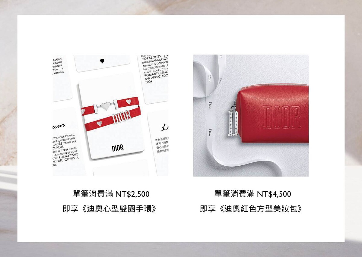 即使線上購物也不會缺少大家期待的滿額贈,單筆消費滿NT2500,即享迪奧心型雙圈手環;滿NT4500即享迪奧紅色方型美妝包。