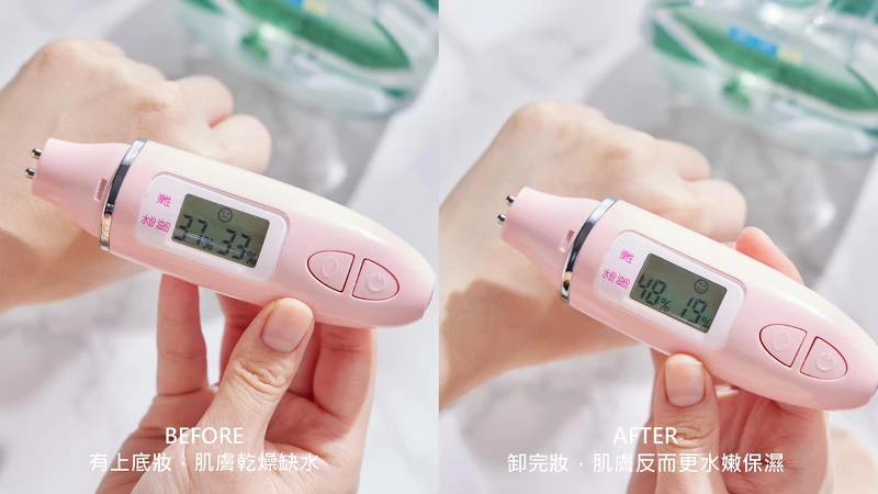 3.卸完妝臉不會乾超舒適!加入經典保濕”雙重玻尿酸”,卸妝也不擔心水分流失,M編卸完倒在沙發上,懶得立刻保養,也不會覺得臉乾乾繃繃的,超級舒服。用保濕儀測試,水分直接飆升11%,卸完妝還更保水,有夠厲害!