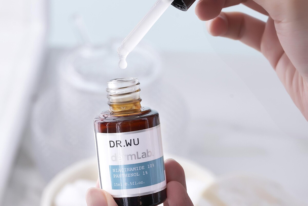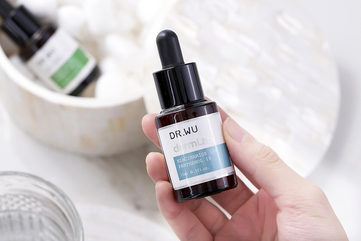 針對乾燥脫屑、暗沉處使用「10%菸鹼醯胺B5舒緩精華」,容易泛紅的兩頰則用DR.WU實驗室精華系列中的「1%積雪草舒敏修護精華」,分區保養對症下藥,更能精準解決敏感困擾!