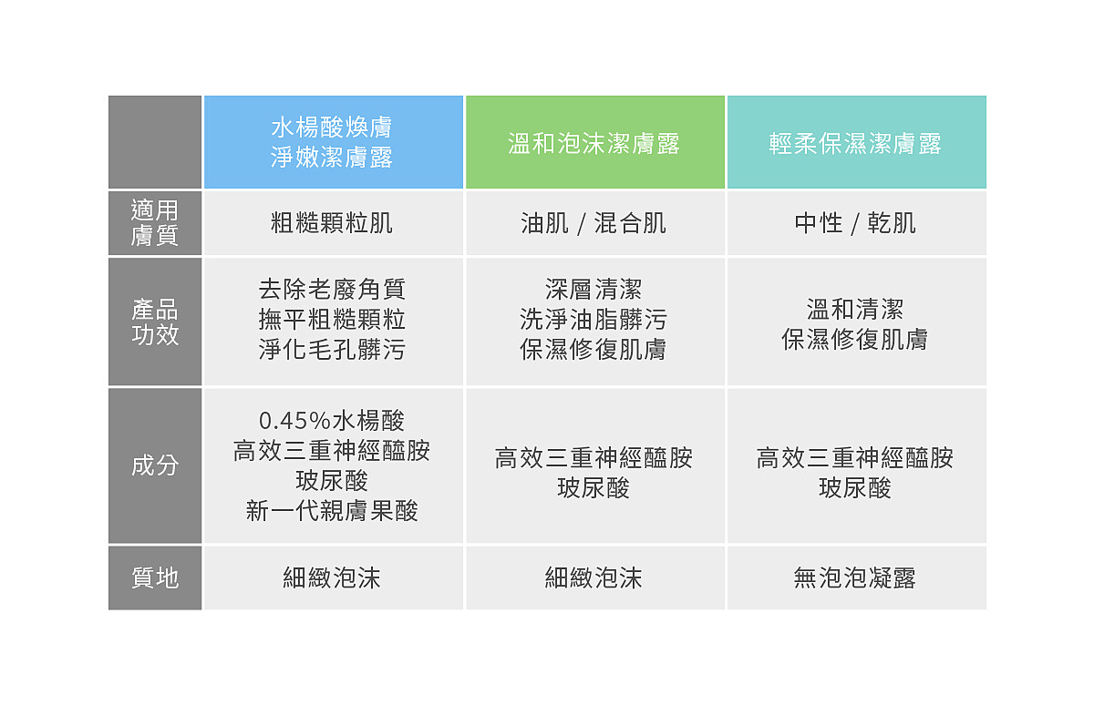 由左至右:溫和泡沫潔膚露、水楊酸煥膚淨嫩潔膚露、輕柔保濕潔膚露