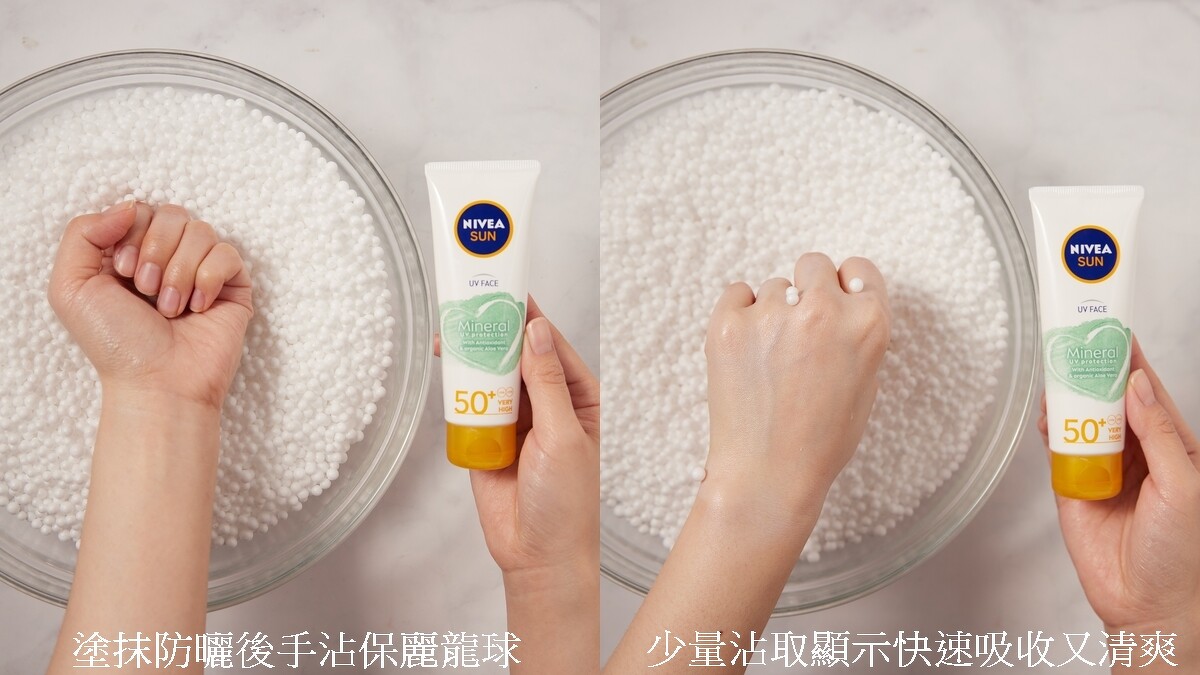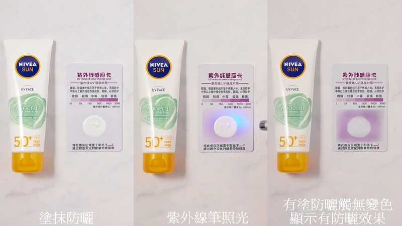 2.高防禦力實測:塗抹後彷彿不存在的清透感,卻有著NO.1高防禦力!M編實測將NIVEA妮維雅全護純萃物理防曬乳塗抹局部後照射紫外線光,隔絕效果超強!這是因為它有著德國領先的物理性防曬科技,另添加Q10配方從根本強化膚質,內外雙管齊下增強肌膚防禦力,提供最高規格的保護!肌膚自然不曬傷、不曬黑、不曬老!