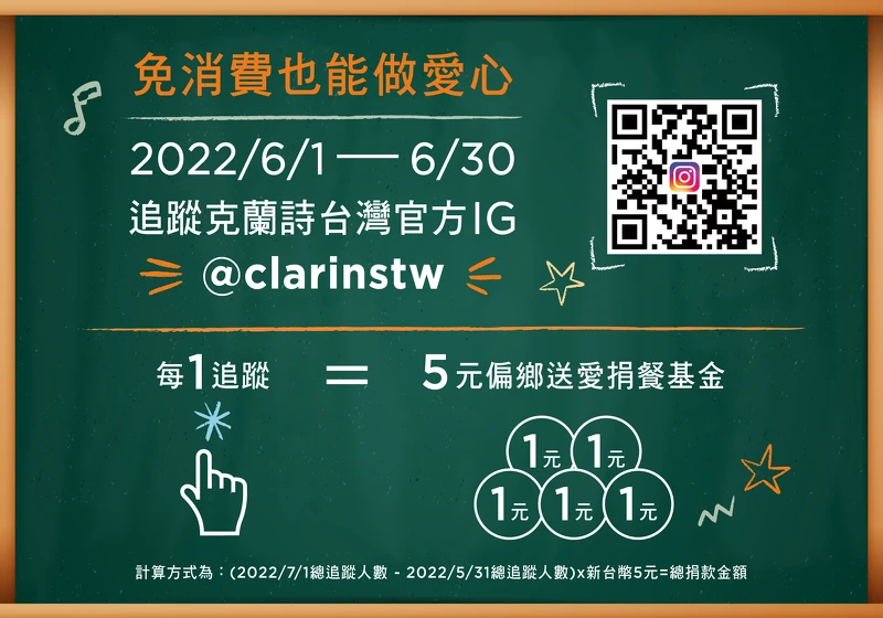 這樣一舉二得的善舉,現在不需花錢大家都可以一起響應!只要請你與身邊的朋友打開IG追蹤克蘭詩台灣IG官方帳號(@clarinstw),六月份每一個追蹤,克蘭詩都會捐出5元給喜憨兒基金會做送愛偏鄉的餐盒基金,等於克蘭詩把大家的愛凝聚起來,而且不用消費就能辦到。為偏遠孩童補充營養,新學期就靠大家了!