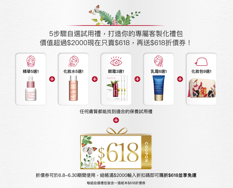 「大家都說克蘭詩好用,可是我沒用過啊….叫我如何幾千塊就這樣刷下去」來~克蘭詩六月就是做公益送愛心,不想盈利(笑),讓妳先試用,覺得好用再回購的願望,重點來了~過去克蘭詩的禮包都是配好一整組,裡面可能有些你不適合的,拿了一個寂寞….但這回不一樣妳有選擇權,自己配好想試用的產品,喜歡再回購!而且今年克蘭詩超有誠意每款試用包都10ml起跳,還可以任選多款經典人氣精華液、化妝水、眼霜、乳液、連同九款原價NT300的超Q設計款化妝包,少少價格自選擇想嘗試的產品,最後結帳竟然還送一張NT618折價券,不就等於投資回本率100%,妳真的沒看錯!
