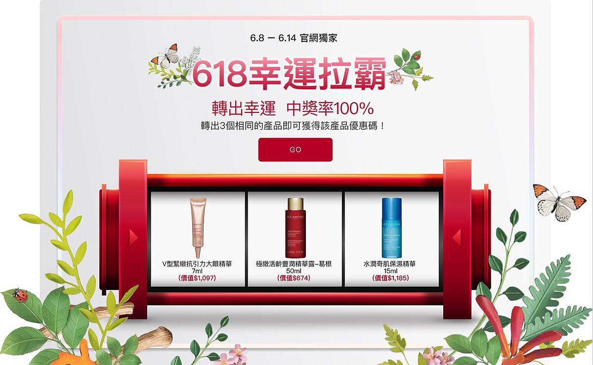 妳買的滿足就是克蘭詩的快樂,因此莊家加碼~結帳滿NT2000就能參加幸運拉霸活動,中獎率百分百,只要轉出3個相同的產品,馬上get該品項優惠碼,M編先預告裡面藏有價值破千的精華,包含價值NT1,097 的V型緊緻抗引力大眼精華 7ml,高達NT1,185的水潤奇肌保濕精華 15ML,還有極緻活齡豐潤精華露-葛根 50ml,價值NT674,快來試手氣!