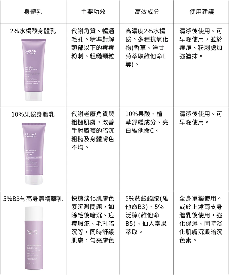 所以,寶拉珍選的2經典+1新品身體乳,各具特色,可以透過「分區保養」方式,精準針對不同區塊的身體肌膚使用,更重要的是,三支身體乳可以相互搭配,達到最完美的全方位身體肌膚保養!比方說,M編的身體肌膚雖然沒有嚴重粗糙暗沉困擾,但夏天經常長背後痘(好痛好煩),也希望讓手肘、膝蓋變得更嫩白一點,穿短袖短褲比較好看…所以我可以用「2%水楊酸身體乳」重點擦背部長痘肌膚,用「10%果酸身體乳」加強改善手肘膝蓋的暗沉,最後再以「5%B3勻亮身體精華乳」塗擦全身肌膚,帶來更完整的提亮柔嫩、健康美肌效果。