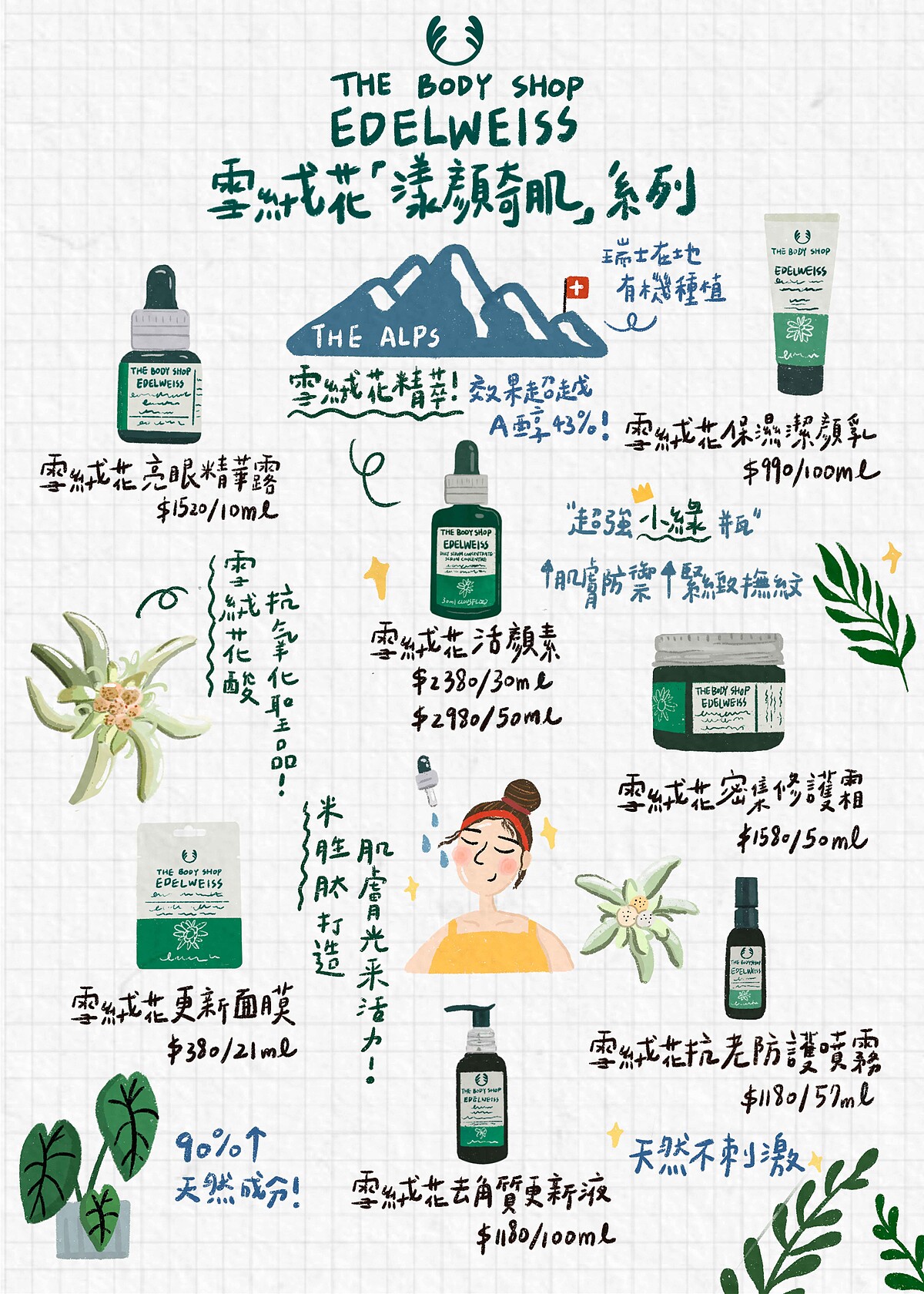生長在3000公尺瑞士 阿爾卑斯山上的雪絨花,為了對抗嚴酷的生長環境,卻仍能茁壯綻放無畏挑戰,其自我保護和修復的特性,種種特質都與鍾瑶個性不謀而合。The Body Shop更以有機種植、手工採摘,在尊重阿爾卑斯山的生物多樣性之下,堅持生產優質的天然保養品。