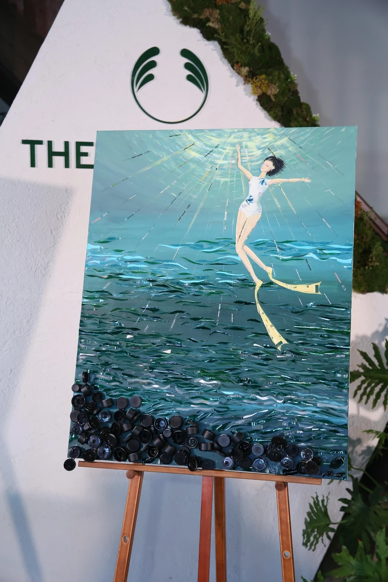 鍾瑶不諱言自己十年的潛水經驗,她多次親眼看到海底堆積了許多塑膠瓶罐,畫面震驚讓她此生都難以忘記。在這幅「勇敢向陽 綻放女力」的畫作上,底部是用回收瓶蓋組成,海底波浪、身穿泳衣、浮潛鞋到肌膚都是回收空瓶、軟管,用剪刀、刀片一片片、一組組剪下來細細貼上,而灑落於海中的陽光則是瓶蓋上的貼紙,這幅由鍾瑶發想、THE BODY SHOP完成的畫作,全世界絕無僅有,不但減少了垃圾的產生,還能變成居家藝術品,這份熱愛地球的美好訊息妳接收到了嗎?