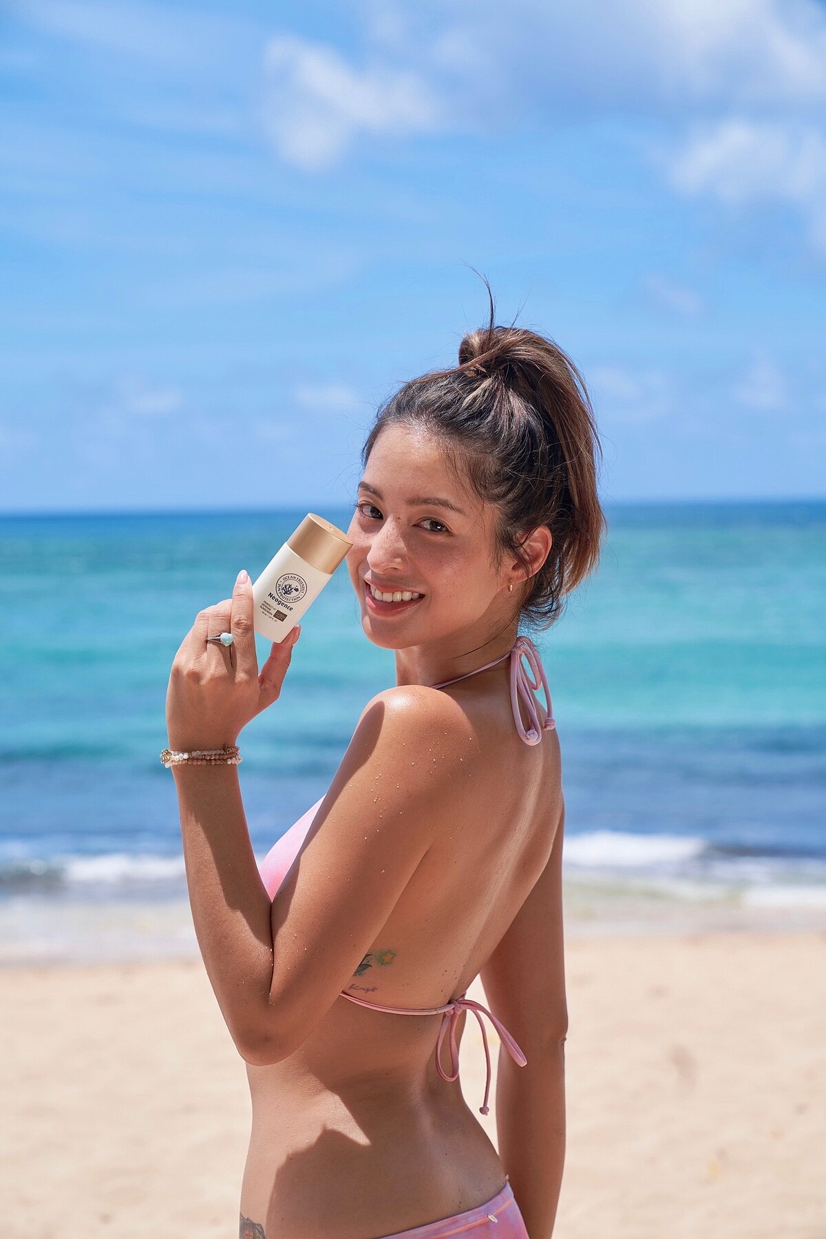 出發到海邊前,馬上拿出她的霓淨思升級版小金瓶「全天候極效抗陽防曬乳」,因為耐水、耐汗所以最適合海邊活動,抗磨擦最強金鐘罩就是獨特抗陽防護膜,穿脫衣服或是包包、口罩防曬都不易脫落,高防曬係數全天候為肌膚防禦紫外線傷害,當然上山下海完全安心玩放心玩!允雯還特別強調,戶外款也一點都不黏,一抹上就輕輕鬆鬆推開肌膚超舒適!