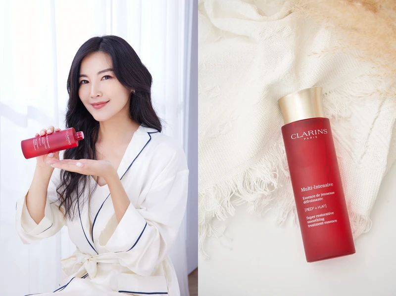卡登說:「我現在比較在乎的肌膚問題當然就是緊緻,因為膠原蛋白的流失,很容易有紋路產生,還有比較會有鬆弛凹陷的問題,對我來講,化妝水不能只能是水!必須是有抗老效果的精華水!而且不能有黏膩度,要摸起來彈潤、拍上去很好吸收!」克蘭詩「美魔塑顏水」完全符合她的高標準!