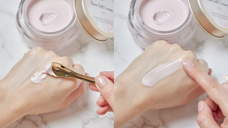 STEP4:「大馬士革玫瑰有機光燦潤澤霜」,抹出柔嫩發光肌