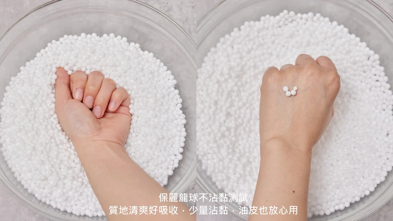 大家最擔心的黏膩問題,完全不擔心~水油質地極度清爽好吸收,用保麗龍球測試,極少量沾黏,油皮人也能放心用。