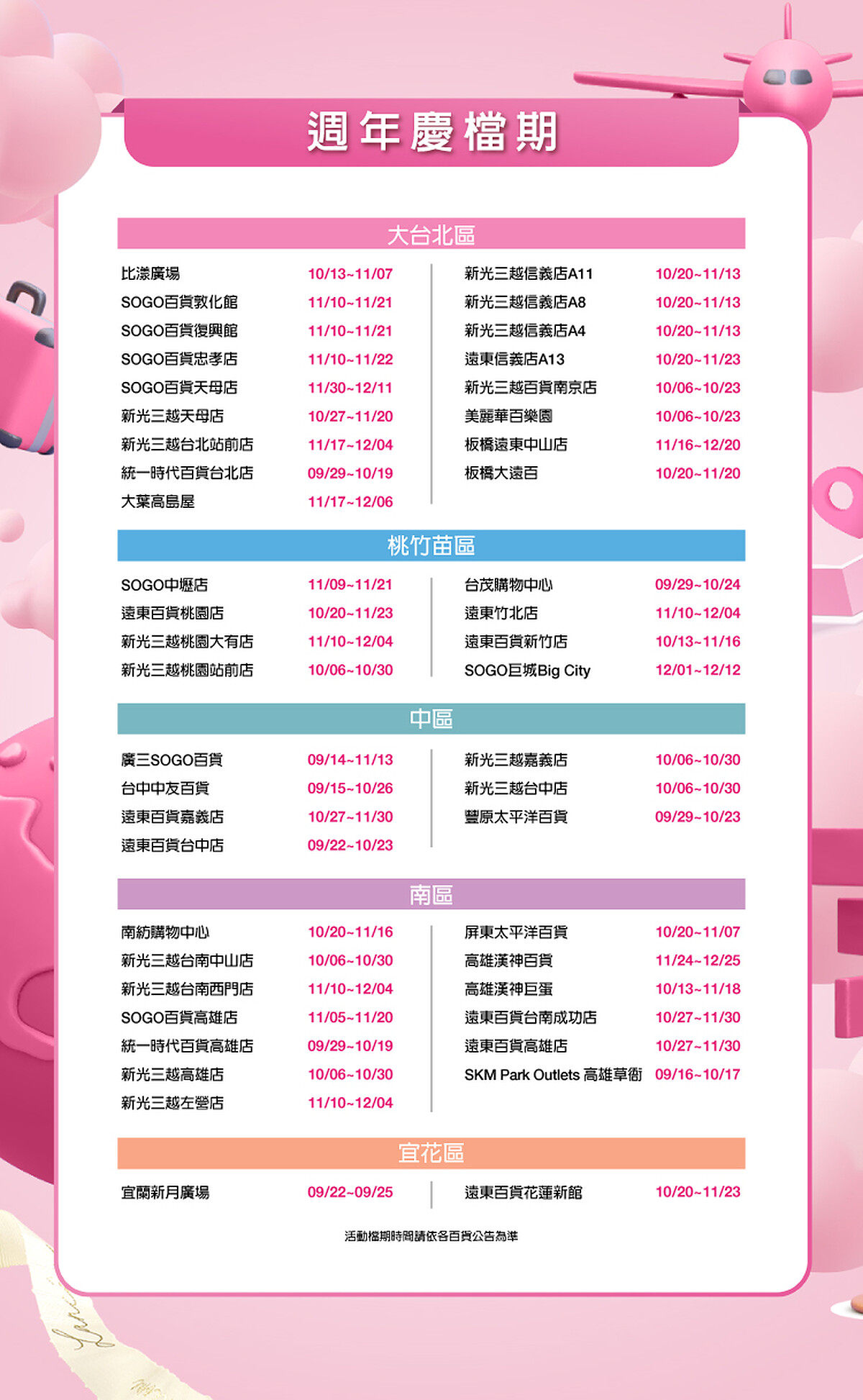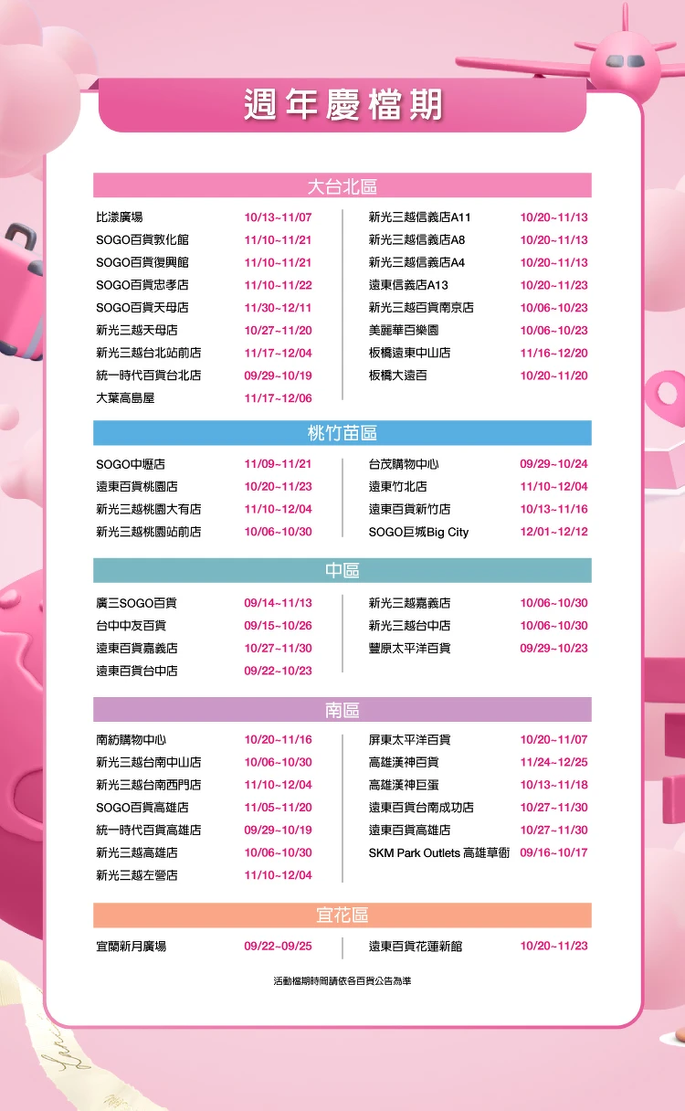 台中中友百貨 (9/15)、遠東百貨台中店 (9/22)、高雄統一時代百貨 (9/29)、新光三越台中店 (10/6)、新光三越南西店 (10/6)、高 雄漢神巨蛋 (10/13)、板橋大遠百 (10/20)、新光三越信義A8 (10/20)、新光三越信義A11 (10/20)、SOGO百貨中壢店(11/9)、 SOGO忠孝館 (11/10)、新光三越台南西門店(11/10)、遠東巨城購物中心 (12/1)