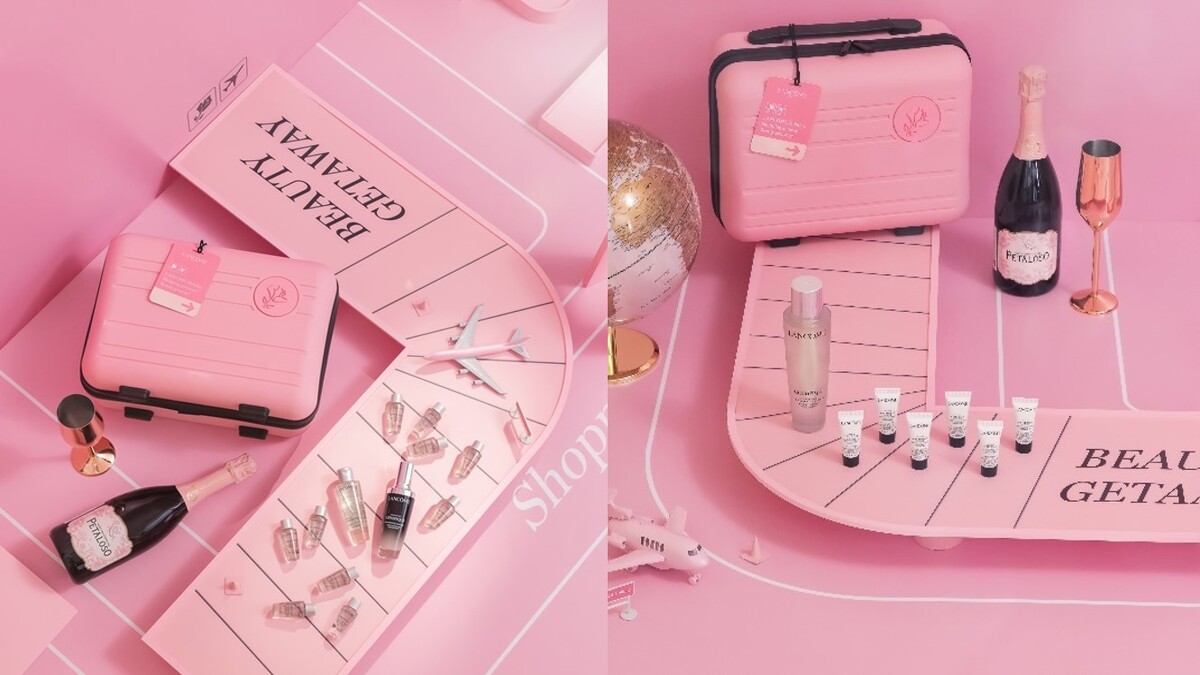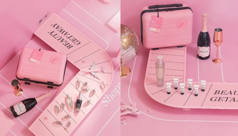 當你以為小黑瓶和極光水的組合已經夠狂夠優惠時,蘭蔻竟再不計成本加碼:首一日到限定百貨櫃點購買神級組合任一組,就能帶走一只美到醉的限量「寶寶粉迷你登機箱」,這卡迷你登機箱中,裝著蘭蔻精心搭配的玫瑰氣泡酒與奢華玫瑰金酒杯,讓皮膚和心情都一起沉浸在粉粉嫩嫩的幸福粉紅泡泡裡!
