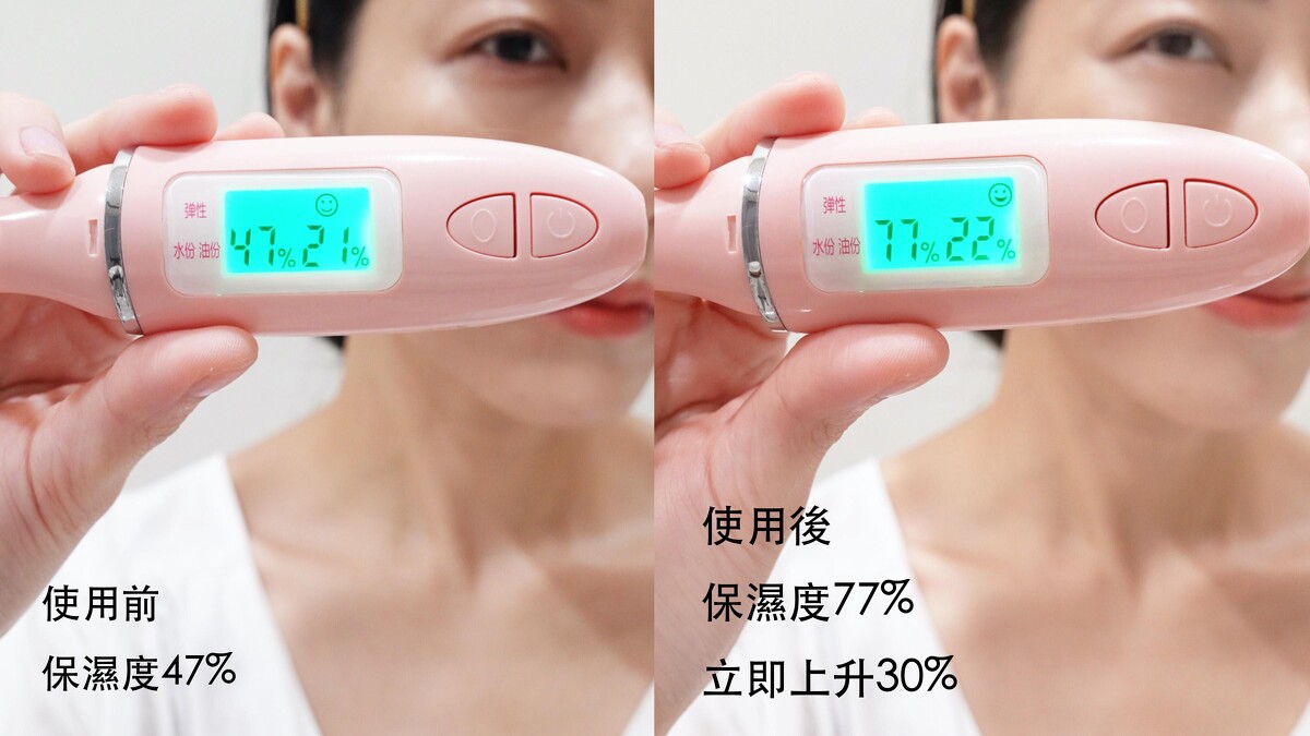 在眼周輕輕按壓塗抹開來就馬上吸收滲入肌膚了,瞬間感受到大量水份注入肌底,肌膚表面超級清爽零黏膩,光是肉眼就看得出來原本暗沉無光澤的眼周立即超柔嫩飽水,立即閃出亮澤水光。飽水度超級驚人絕對不是M編說說而已,來用保濕檢測儀實測就知道有厲害!使用前後保濕度直線大飆升是不是真的無敵很誇張!