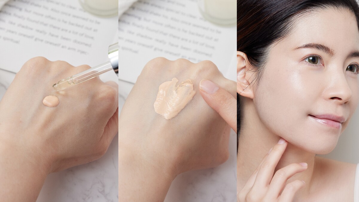 上妝時加入1-2滴角鯊潤澤修復精華油在粉底液、混合後上妝,打造服貼透亮的底妝。