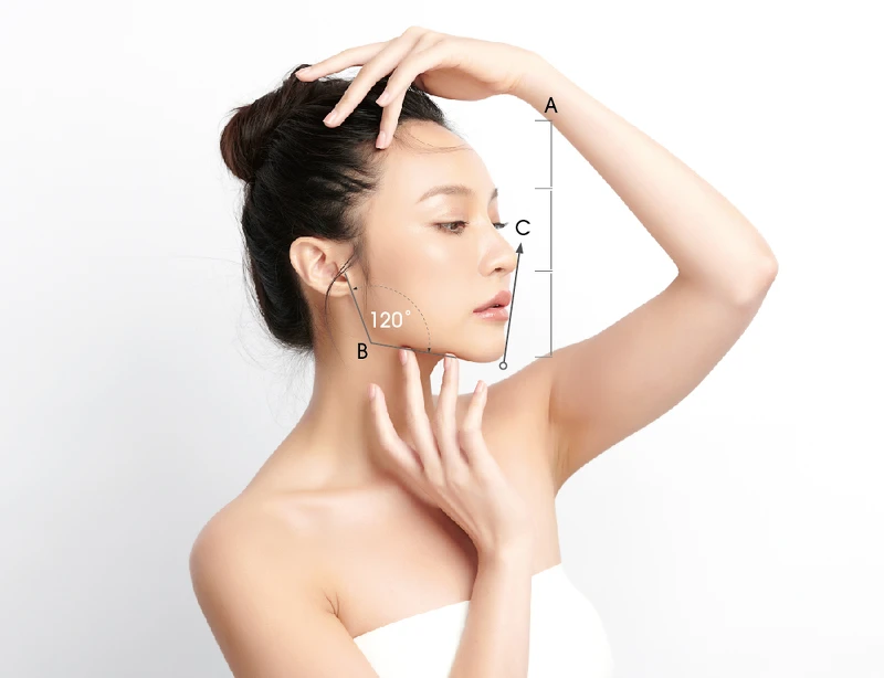 「下巴為什麼那麼重要?因為它決定了臉型比例的關鍵!下巴長度與翹度適中,就可以讓五官看起來更立體。而所謂的最佳比例就是髮際線到眉間、眉間到鼻底、鼻底到下巴末端這三段應該是1:1:1的黃金比例;另外從側面來看,鼻頭、上唇與下巴連成一條線,則是完美的側臉線條,臉部比例就會更和諧!但有些人因為天生骨骼形狀的關係、或是後天習慣用嘴巴呼吸,造成下巴後縮、視覺上看起來也有短下巴問題。另外從耳垂到下巴側臉線條的下顎角也很重要,以角度120度的自然弧度最完美!下顎線線條清晰,側臉看起來就會精緻且立體。」這也是為什麼韓國女星宋慧喬、孫藝珍的側臉常成為大家最想要的模範臉型,不管正面、側面都如此柔和且無懈可擊。