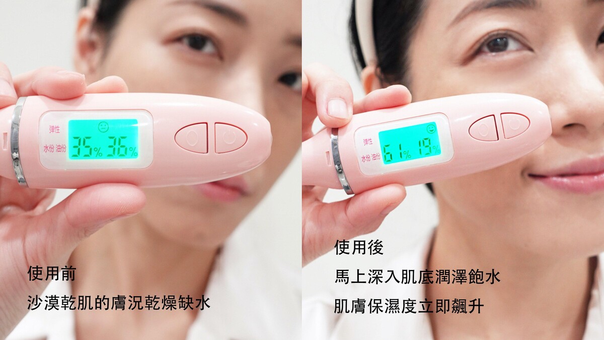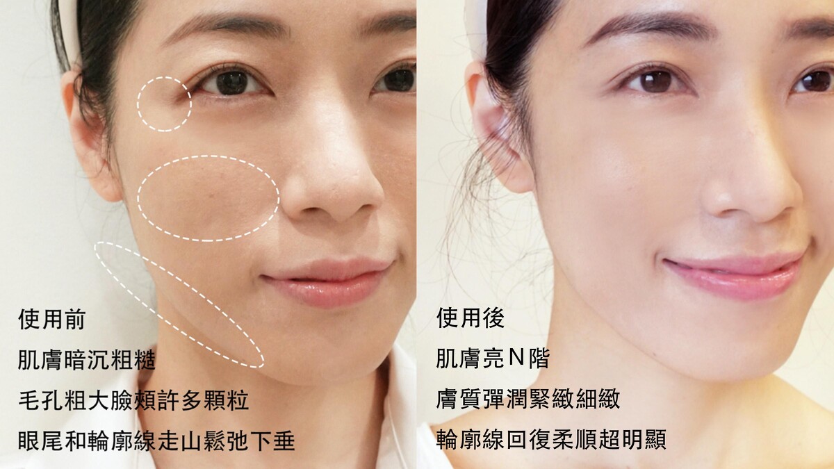 使用完馬上有感,肉眼就馬上看得見摸得到肌膚立刻水潤回彈,細緻柔嫩,徹底告別乾繃,認真使用約一週,M編的膚況快速回復健康狀態,甚至更勝少女時期的健康彈潤,連小細紋都神隱了,視覺年齡直接減掉5歲以上!老化膚況OUT,原本暗沉無生氣的肌膚零死角膨潤發光!