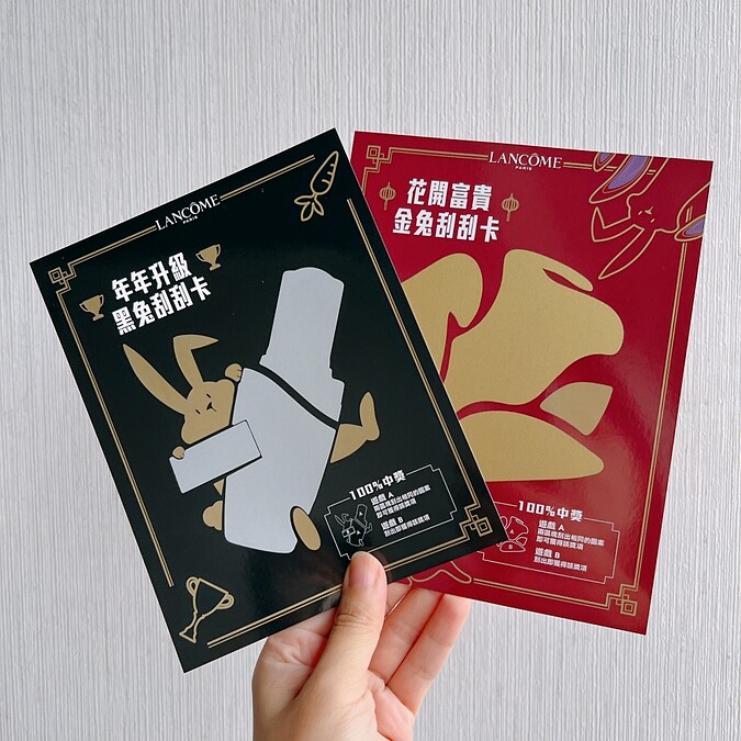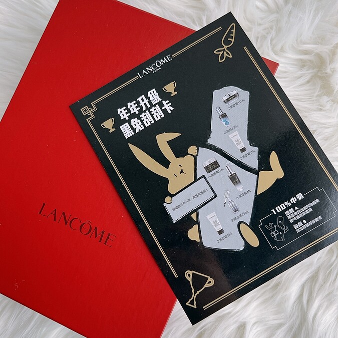 2023/1/1~1/31,只要於全台蘭蔻專櫃購買任一件超未來肌因系列產品,就可獲贈「黑兔刮刮卡」,買一件送一張、買兩件送兩張以此類推。同一期間靠櫃單筆購物滿NT6,000則可獲贈「金兔刮刮卡」(黑兔、金兔刮刮卡可累計贈送,兩者皆數量有限,贈完為止。可與滿額贈累計贈送)。