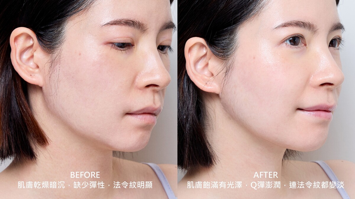 BA對比照更是差異大到M編以為自己去做醫美(但真的沒有),很明顯看到肌膚揮別暗沉、變得柔嫩光澤,再來就是澎潤度,讓顯老的法令紋都變淡了,看起來直接-5歲阿~