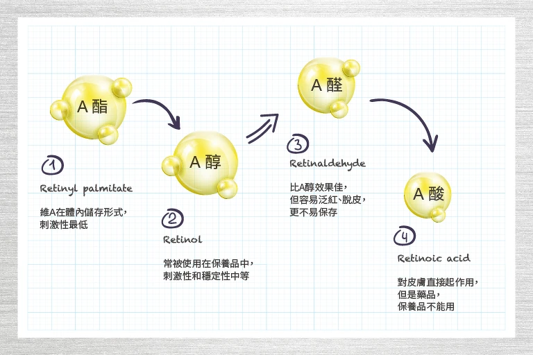市面上與A醇保養品有關的成分還有A酸、A醛、A酯,該如何選擇才有效?M編先來段美肌小教室幫助大家了解。A醇是維他命A的衍生物之一,A酸、A醛、A酯也同是維A衍生物的成員,不同身體部位運用的衍生物不同,像皮膚只對A酸有反應,A醇跟胚胎有關、A醛則是眼睛。那為何不直接使用A酸呢?原因是A酸太過刺激只能由醫師處方使用,保養品中禁止添加,因此只能使用另外三個衍生物,它們被皮膚吸收後會依A酯→A醇→A醛這個步驟轉換成A酸而被利用,通常轉換步驟越少的效果越好,但也越刺激、越不穩定。