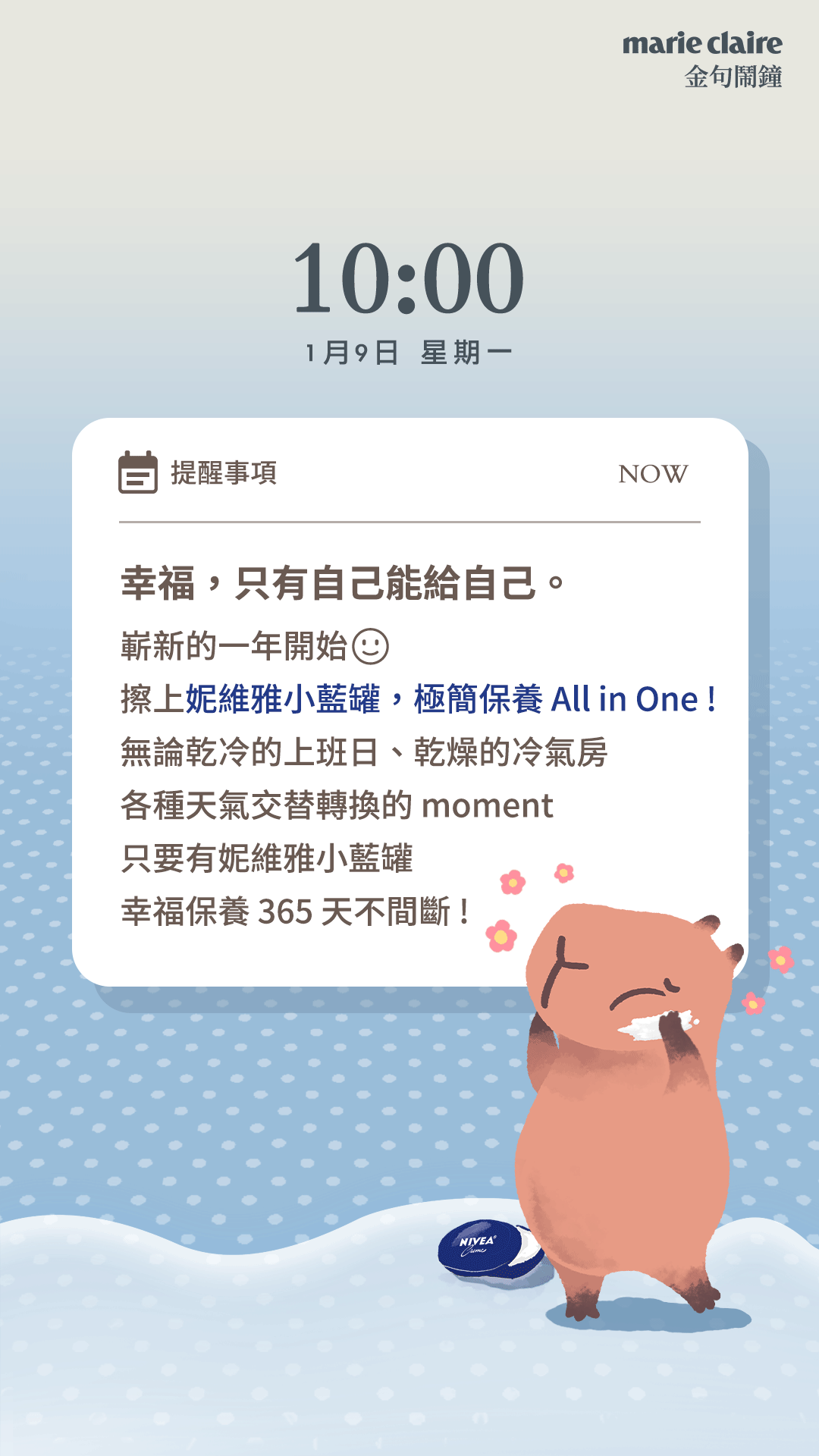 「幸福」不是等到賺更多錢,生活安定下來的時候;也不是卡債都還完,可以瘋狂購物的時候;而是現在、每個瞬間,你自己就能創造最幸福的時候!快樂不用等著別人來給予,跟著水豚妮妮擦上妮維雅小藍罐修護乳霜,開啟療癒保養儀式,這個瞬間就是幸福!面對換季肌膚乾燥、辦公室空調不適,妮維雅小藍罐絲滑的乳霜質地富含專利綿羊油醇、維他命原B5,更採用獨特油包水科技,一抹就能修護粗糙,給肌膚24小時輕柔潤澤!幸福保養365天不間斷,滑彈Q嫩的膚觸讓你天天都有好心情!