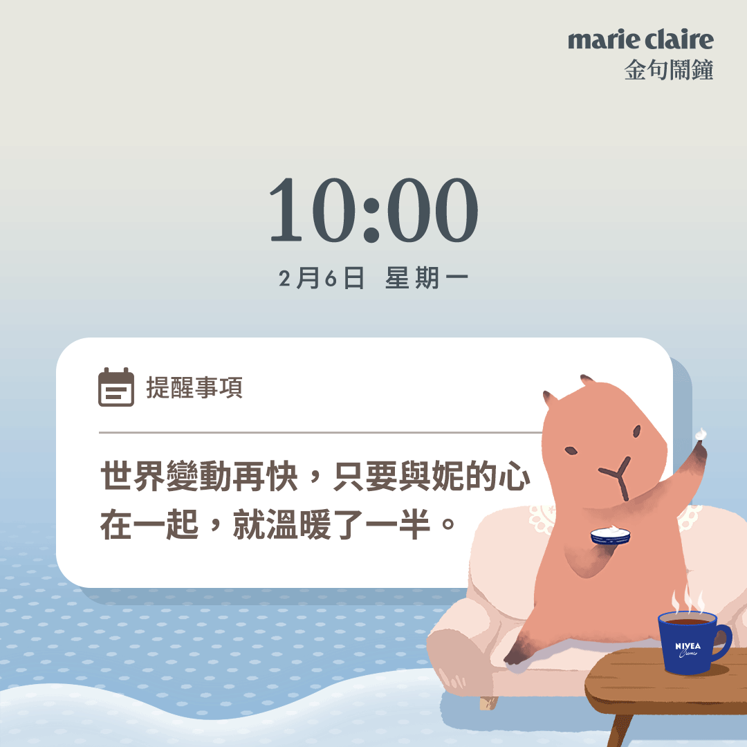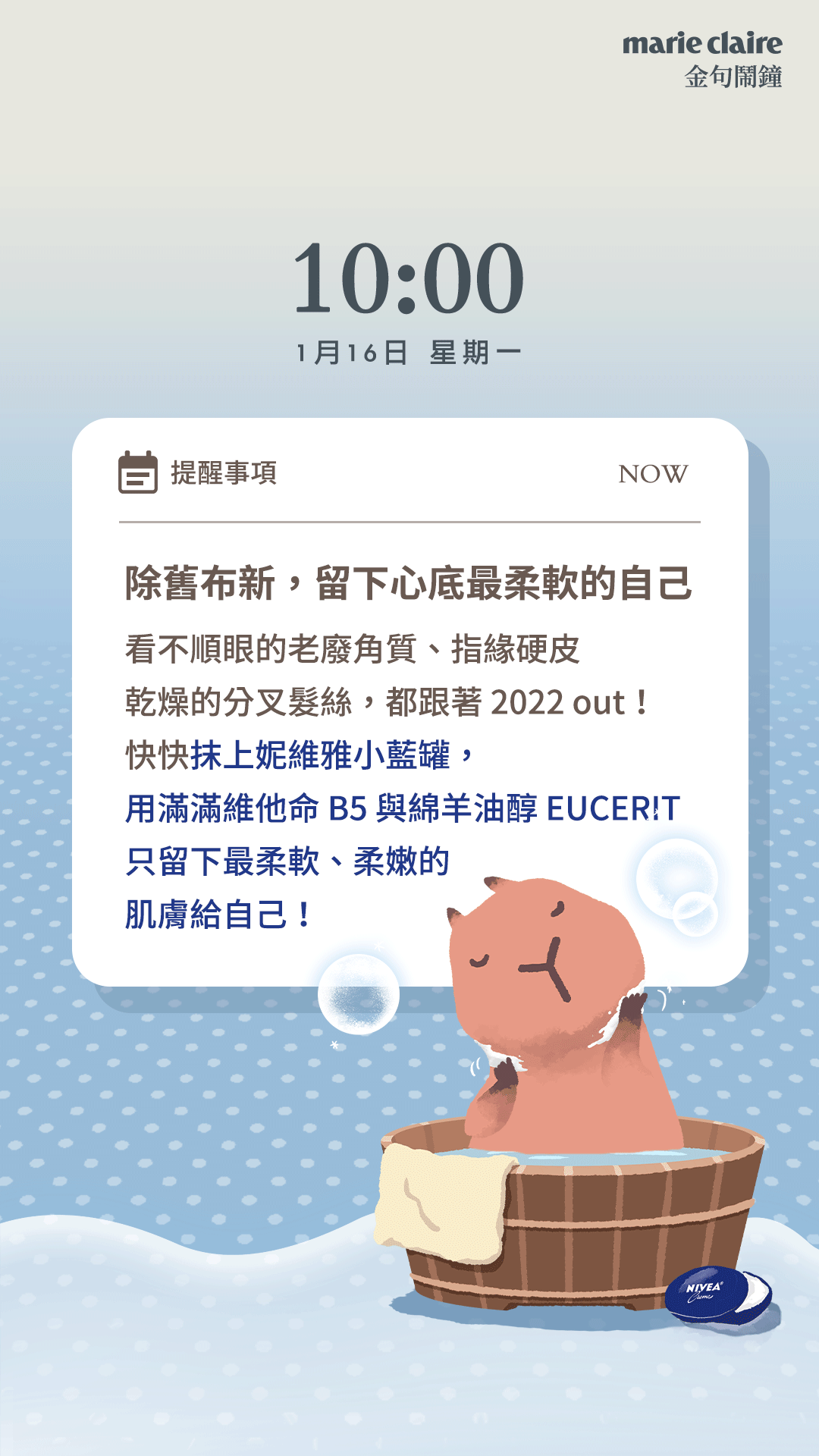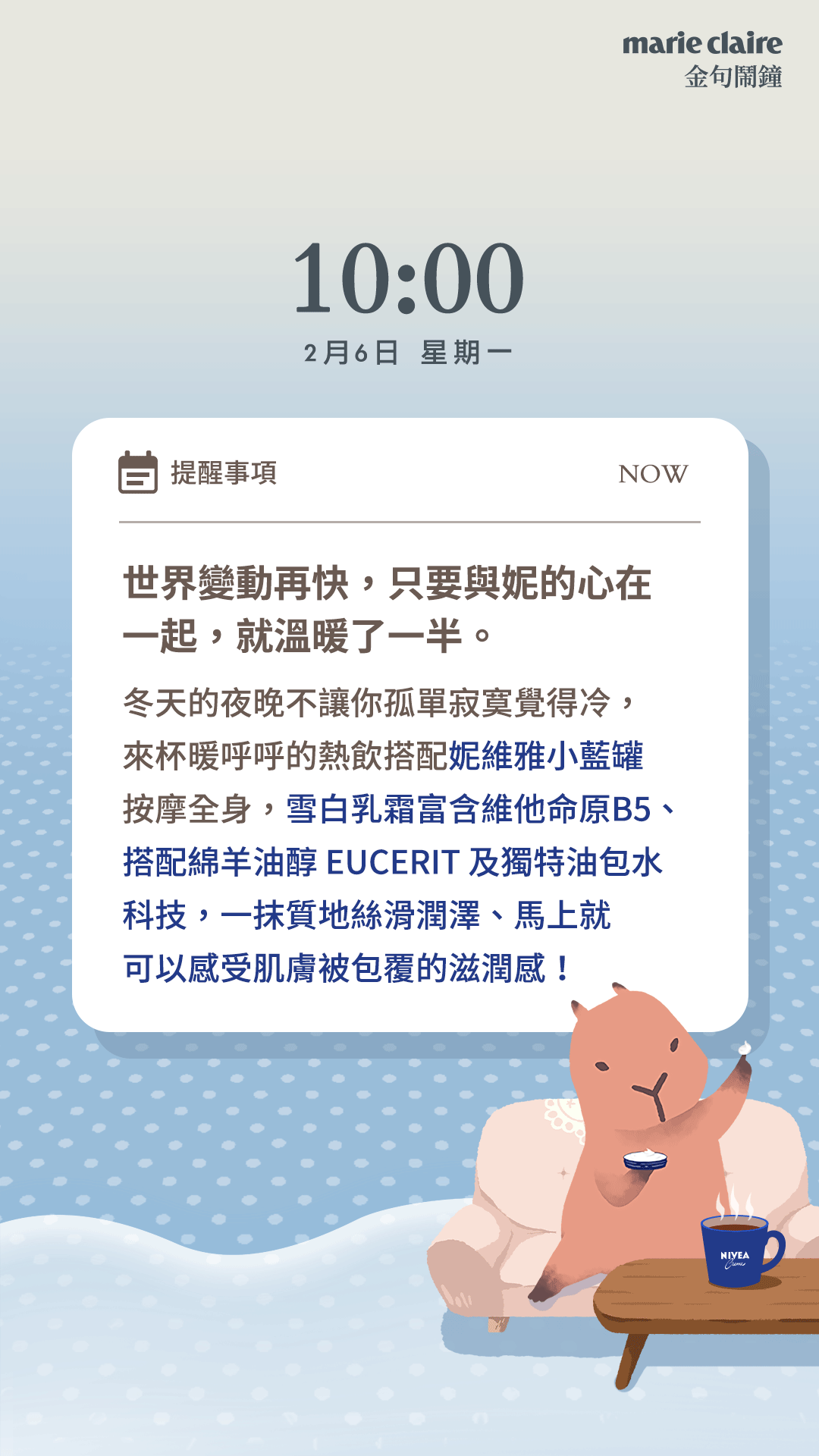 即使一個人,也不讓你孤單寂寞覺得冷!讓水豚妮妮陪你用妮維雅小藍罐修護乳霜按摩全身,肌膚與心情就溫暖了!聞嗅著小藍罐熟悉的香味,彷彿像是認識多年的好姊妹陪伴著你,在乳霜中滴入美容油,就能當作按摩乳液好好呵護保養全身!可以特別加強腳後跟,讓粗硬的肌膚變成光澤柔軟!也能厚敷全臉,給肌膚滿滿的滋養!就連匆忙出門的時候發現膚況不佳,也能在粉底中加入少許妮維雅小藍罐,給予粉底超強磁力保濕貼妝一整天!有妮維雅小藍罐,就像有一個最令人安心的夥伴,世界變動再快,它總是在你身邊、時時溫暖著你~