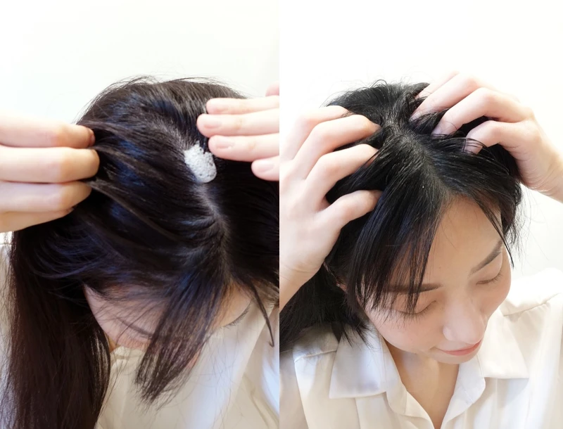 來,看M編示範:將頭髮撥開使頭皮盡量露出,同時用另一隻手將泡沫塗抹於該區域的頭皮上。當慕絲滲透進入毛囊,毛囊活化預備起~