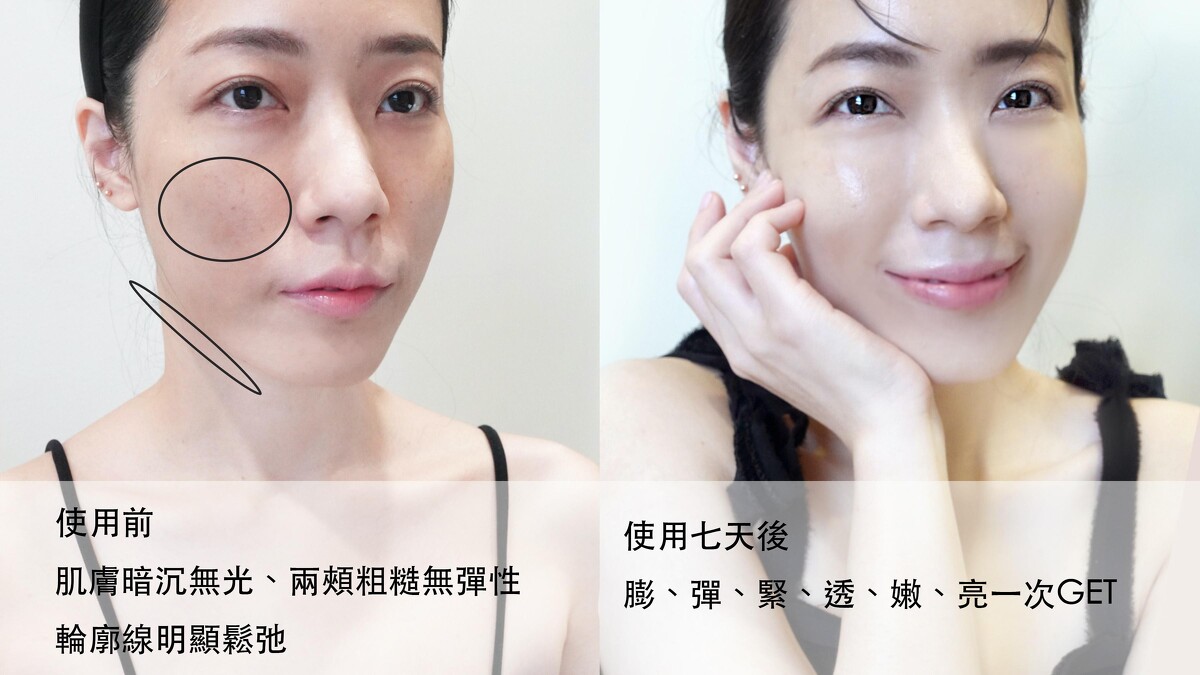精華液質地的化妝水,一抹肌膚立刻感受到豐厚濃密的水感滋潤,輕抹推開完全吸收滲透肉眼就看得出來凹凹無彈性的兩頰快速由內而外部膨潤,膚觸馬上變得超級柔嫩膨皮,早就出走很久的蘋果肌秒速回歸,瞬間緊緻超有光澤,肉眼都看得出來連輪廓線也緊緻到不行!
