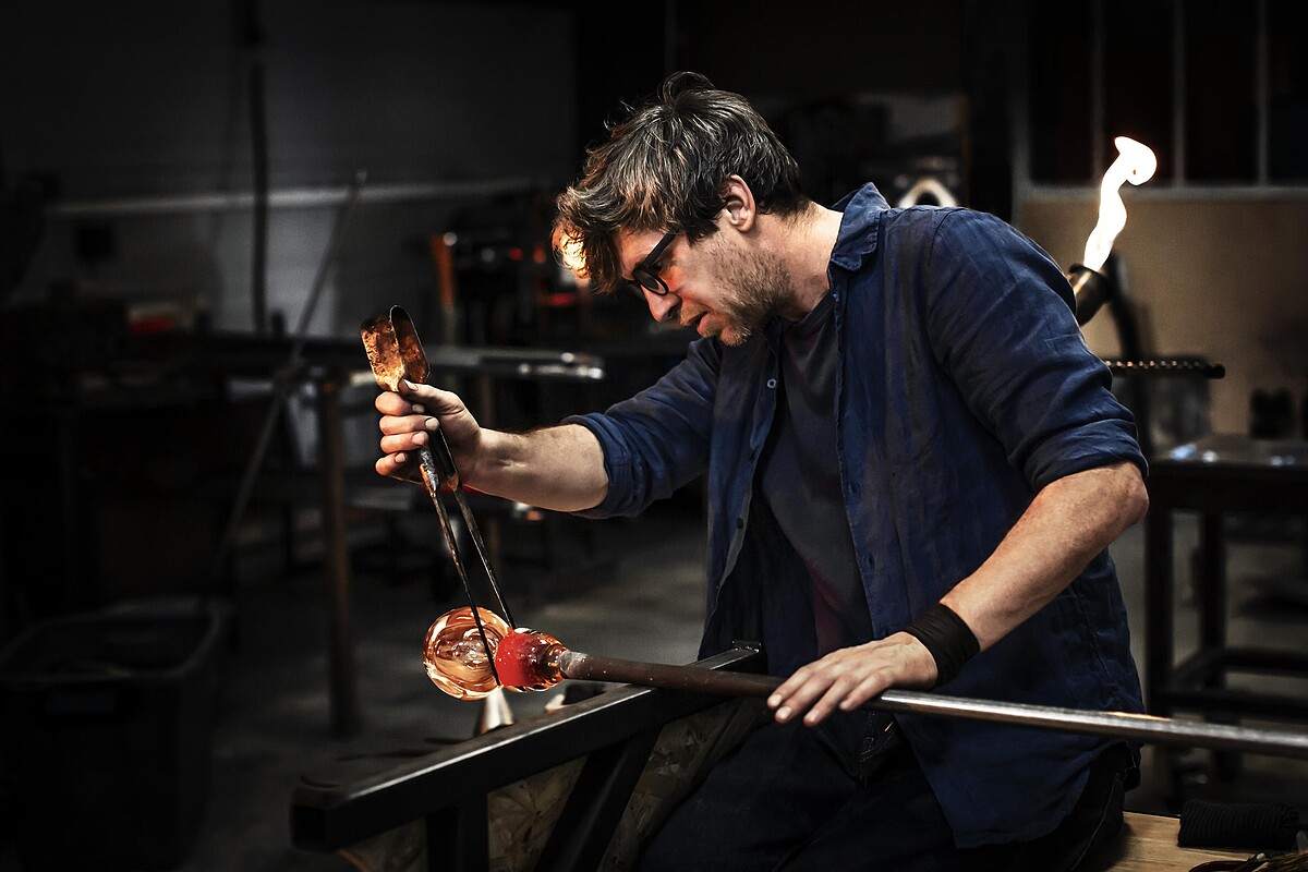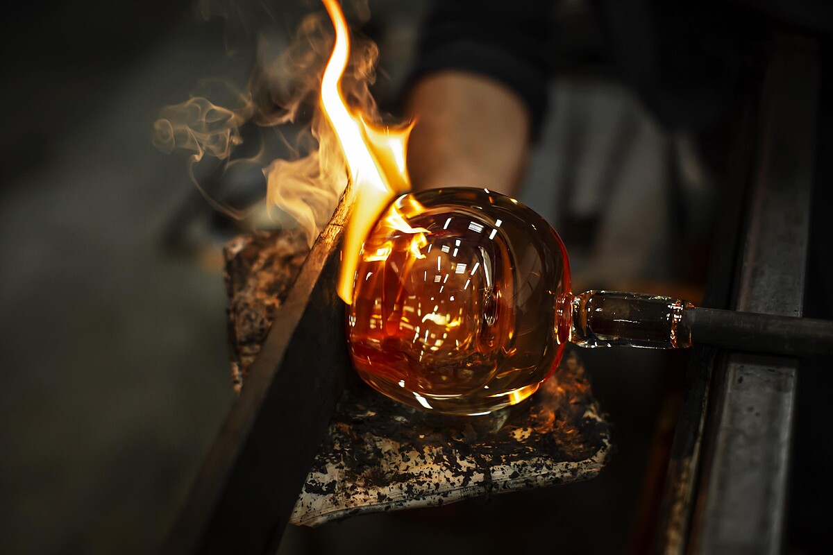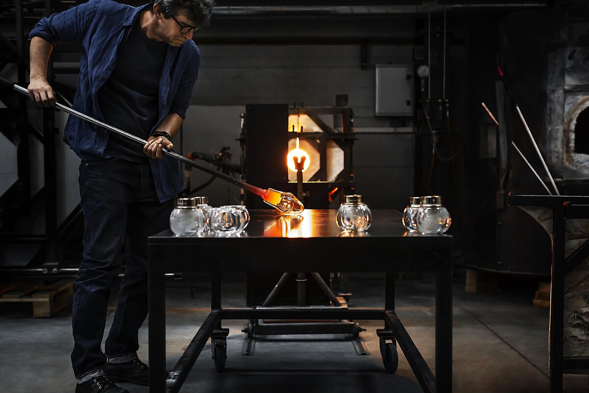 製程秉著高訂精神,全球推出的130瓶都由藝術家親手打造。在高溫昏暗的玻璃廠房內,創作者需耐著蒸熱氣長時間與玻璃共處,經歷爐中吹製成型、手工切割拋光、鑲嵌雕製、篆刻專屬編碼,耗費整整24小時於黑暗中走一遭,才得以完成一只晶瑩剔透、如神話「酒神果實」的玻璃寶石。