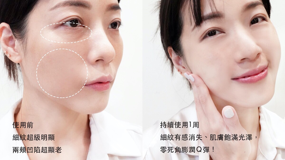 持續使用1周比對,不只細紋消失,凹陷的臉頰也恢復膨潤,視覺年齡直接降10歲!新一代撫紋霸主絕對只能是「高效胜肽膠原緊緻精萃」,全臉散發零死角的Q彈與光澤,絕對是終生追隨的神級單品!