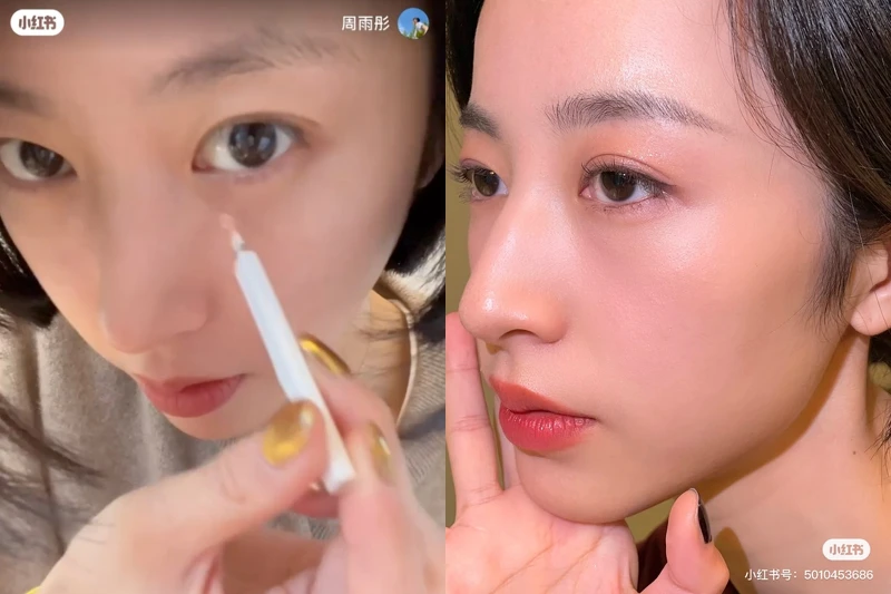 周雨彤的妝容其實非常簡單,最重要的就是遮瑕,尤其是黑眼圈、法令紋等部位。