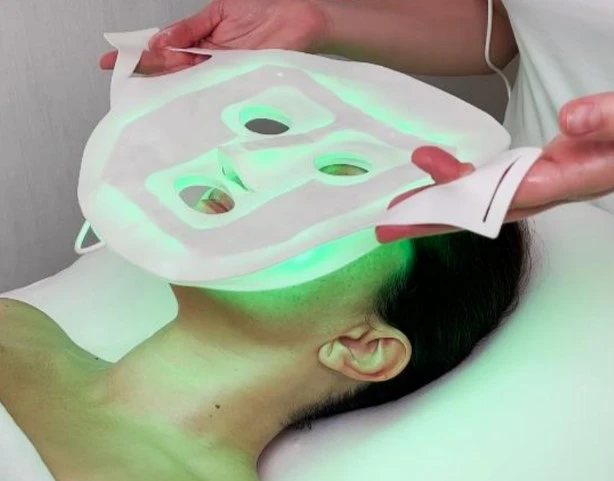 以科技感的LED 波光,刺激不同深度的肌膚層。藉綠光波波長(413 nm)調理肌膚,得以改善暗沉與不均膚色、舒緩平衡,達到全面性的紓壓放鬆。並且於光照面膜期間,不停歇接續按摩身體及手部肌膚。