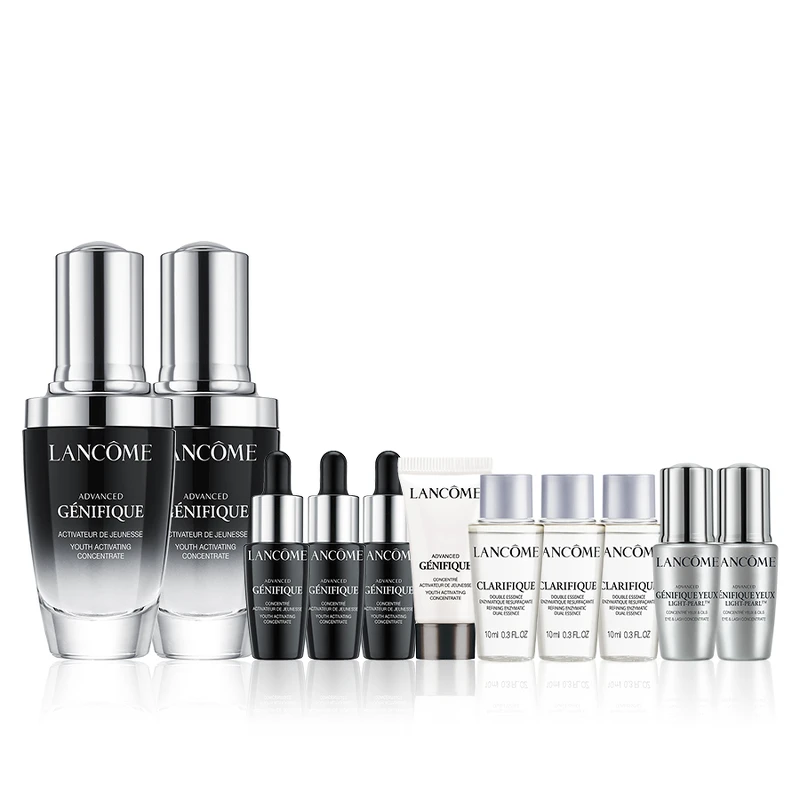 優惠比照周年慶規格的寵粉大手筆!小黑瓶、極光水用得兇的姊妹快手牽手一起登機!除了兩大人氣擔當,還有蘭蔻亮眼冰珠、胜肽青春霜都推出機上組合,快把握機會一日HIGH購去!