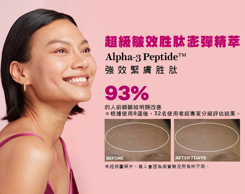 當肌膚開始產生 皺紋、乾燥,你應該嘗試「超級皺效胜肽澎彈精萃」,它是一款質地輕盈、吸收迅速、幫助肌膚恢復彈性的胜肽澎彈精萃,可輕鬆使用於每天肌膚保養,淡化皺紋,使肌膚有由內而外恢復光澤亮麗。結合珍貴紅藻菁萃(有助於皮膚補水,增加保濕度)、薑黃根提取物(有助於提升肌膚亮度、加強肌膚對環境的保護力),幫助肌膚恢復年輕光彩的胜肽澎彈精萃。