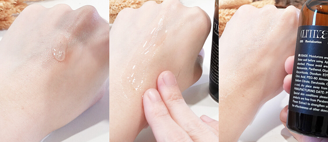 #005精華設計成水凝露狀的質地,適合直接在每天清潔完臉,臉部濕潤時、保養前當作按摩養膚液,在保養前先用#005按摩肌膚,除了幫助延緩肌膚老化之外,搶先活絡肌膚,再進行日常保養時更能幫助後續保養吸收力。