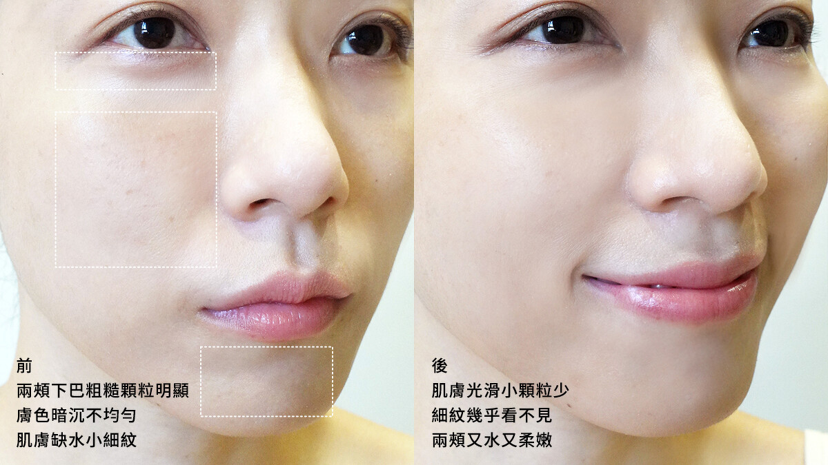 M編每天認真使用#005,短時間內肉眼就可見難搞的細紋被撫平了非常非常多、原本疲累暗沉的氣色亮了好幾階,明明熬夜趕稿卻像天天睡飽美容覺,甚至連兩頰的惱人粗糙的顆粒感消大銳減,整張臉水潤飽滿保濕到位,毛孔油水失衡的問題自迎刃而解。肌膚好嫩好光滑,一摸超咕溜心情有夠療癒!身為敏感肌的M編才使用產品兩週,膚況煥然新生,有種快樂叫「每天散發健康光澤光澤美肌」,真的完全找不到不大推的理由啊!