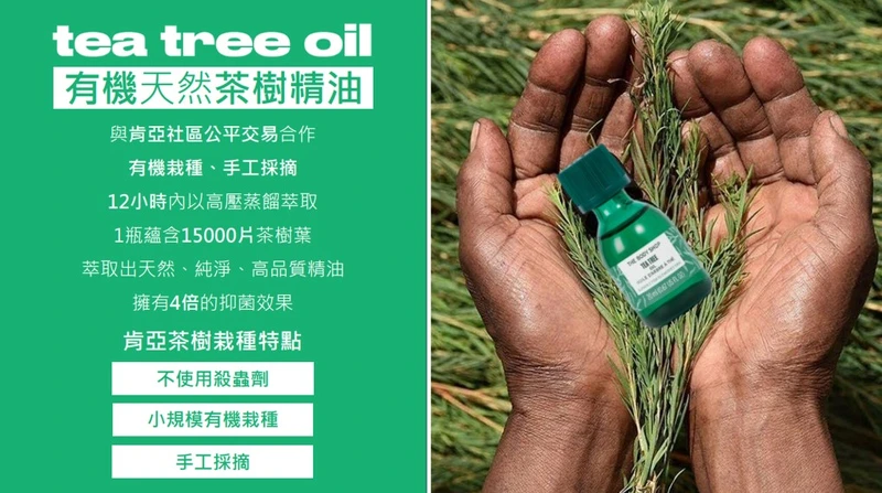 身為夏日神品THE BODY SHOP每到夏天都賣到缺貨,讓櫃姐的心臟經常很緊張的茶樹系列,因有能淨化肌膚、舒緩平衡油脂的茶樹精華,透過社區公平交易取得來自肯亞地區,不使用殺蟲劑、小規模有機栽種,手工摘採後12小時內萃取出高純度的精油,賦予夏日肌膚清涼舒暢感。
