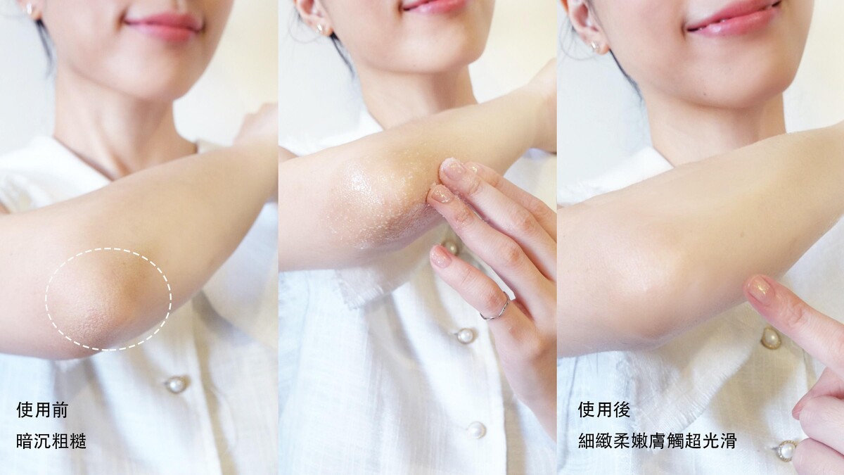 M編建議一開始每週使用兩次,或是先使用在像是膝蓋、手肘、腳後跟特別暗沉粗糙的部位,先用銀色小勺均勻攪拌之後,用畫圓的方式輕柔按摩肌膚。去角質後,瞬間肉眼馬上就看得出膚色完全提亮好幾階,大象粗糙肌變光滑有夠咕溜,但絲毫不緊繃,更狂的是,明明用的是去角質,但是像是擦了保養品,肌膚超柔嫩超保濕,乾燥粗皮原地新生柔嫩baby肌,持續用了一段時間,肌膚持續維持絲滑有光澤的狀態,連M編自己都被這好膚質著迷到尖叫啊!