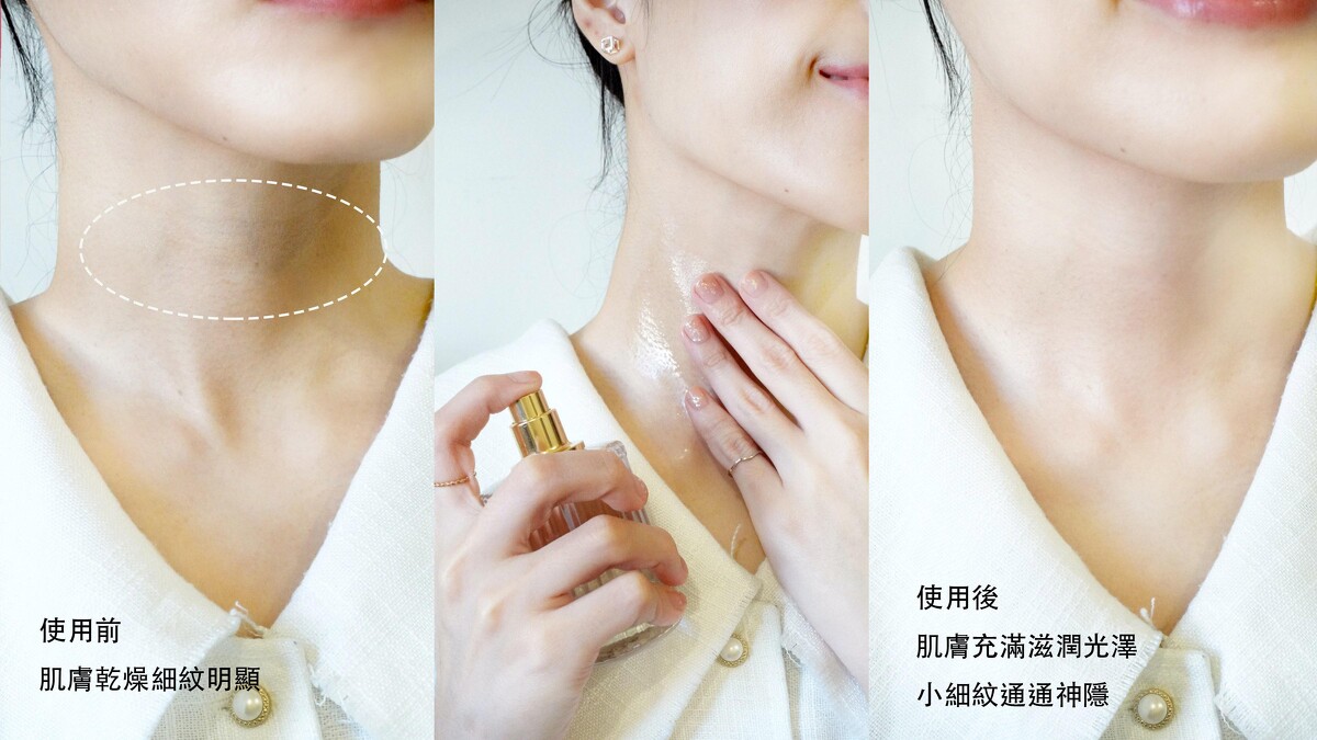 噴頭式設計使用上超方便,噴出水霧質地有夠細緻,噴灑在肩頸、關節再以畫圈方式按摩到吸收,少一條細紋相當減齡3歲,小細紋瞬間被填平!肌膚真的有好命的飽水光澤,M編馬上奉上使用前後對比照,有圖有真相,滋潤效果實在太無敵!而且認真感受到膚質越來越穩定,原本容易乾癢的肌膚狀況漸漸都通通消失!