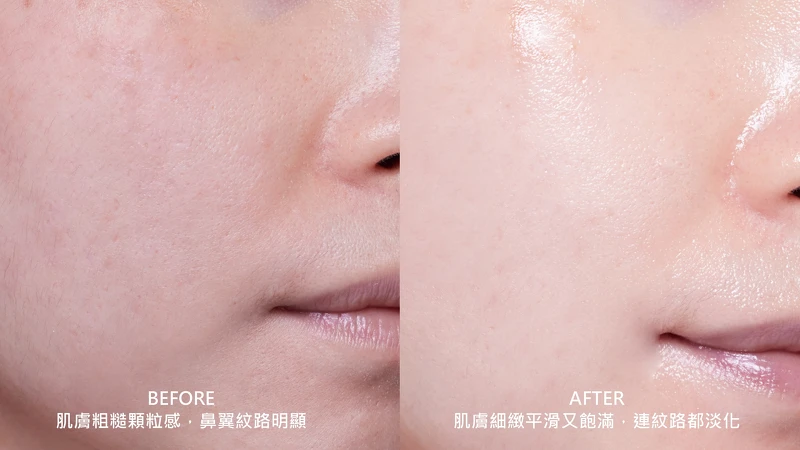 除了精簡保養程序之外,持續使用還會發現肌膚愈來愈健康,M編以往動不動就容易泛紅的肌膚,維持穩定狀態時間拉長了。連最討厭的粗糙顆粒感、以及顯老的紋路問題也漸漸改善。