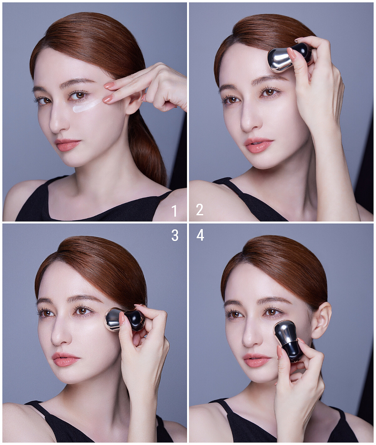 將「頂級雙效亮眼珠」置於眼下,由眼頭到眼尾輕點壓4次,重複2次,幫助眼周微循環。