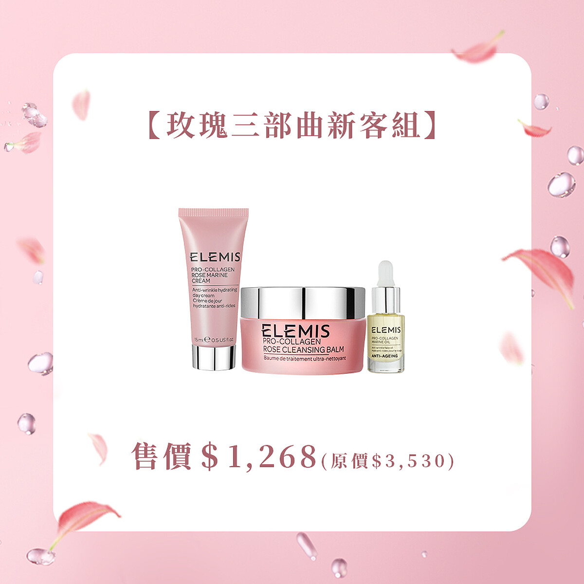 組合2.玫瑰三部曲新客體驗組:超殺35折無痛入手玫瑰三部曲!海洋膠原精油卸妝膏(大馬士玫瑰)20g+海洋膠原玫瑰緊緻精華乳霜15ml+海洋膠原玫瑰精萃油5ml,特價NT.1,268、原價NT.3,530。