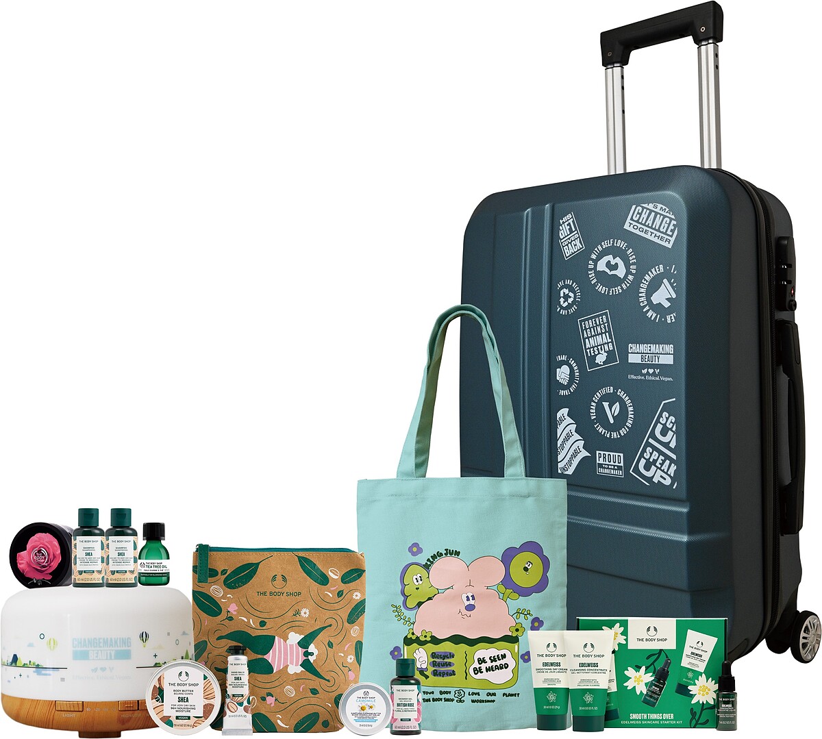 讓你買得多THE BODY SHOP也要讓你免費拿更多!今年週慶推出史上最有誠意滿額贈活動,最低門檻居然只要999,不只有明星商品旅行組,與插畫家KINGJUN限定聯名的獨家帆布袋,讓你在家香氛療癒的水氧機,還有超級大獎行李箱也要免費送給你!如果一個人戰力太弱,快約媽媽姐妹一起湊單,或順手幫男友也買好身體頭髮保養組,一起成為高顏值情侶吧!