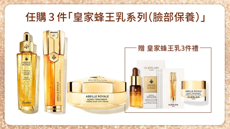 消費10,500元(不含特惠組合),可獲得「皇家蜂王乳修護禮」,內含:皇家蜂王乳蜜露 40ml/皇家蜂王乳平衡油3G 5ml/皇家蜂王乳頭皮修護精華5ml/皇家蜂王乳雙導精華體驗禮(輕巧盒裝版) /皇家蜂王乳蜂蜜修護白霜7ml/皇家蜂王乳蜂蜜修護黑霜7ml/皇家蜂王乳超拉提亮眼霜 3ml/皇家蜂王乳3D繃帶超導面膜1片。