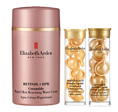 伊麗莎白雅頓今年九月甫推出「少女水潤霜」HPR 玫瑰金抗痕水潤霜,核心成份超智慧雙A精華(A醇+HPR)功效是純A醇的10倍,帶來加倍的效能和呵護。(HPR新世代維他命A容易滲透肌膚,又能降低A醇的刺激,結合A醇後比純A醇更速效又低敏)。週年慶推出的超值組合,不僅能率先使用新品,當中還有穩定肌膚屏障必備之超進化黃金導航膠囊與超進化輕感黃金導航膠囊各7顆,買1送14顆。