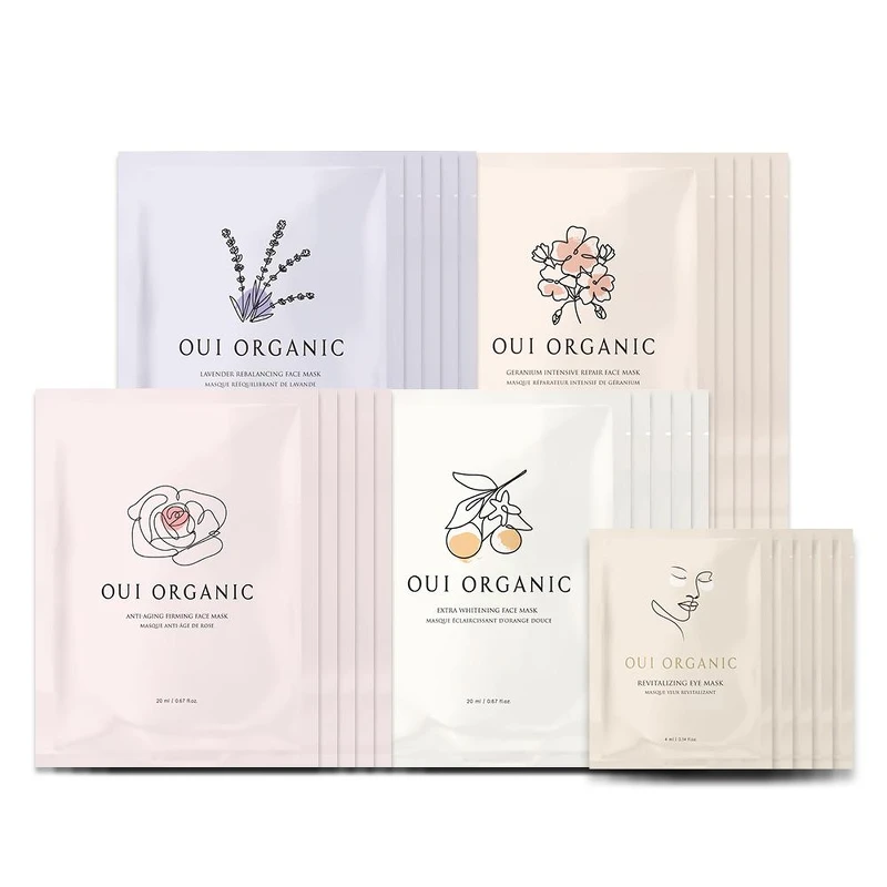 OUI ORGANIC敷敷植萃面膜系列包含四款面膜:玫瑰保濕、甜橙亮白、天竺葵舒緩、薰衣草控油及一款晶亮眼膜,全成分97%以上源自天然,並且採用歐盟ECOCERT認證成分,確保原料來源及製程皆符合環境保護並達到最高品質規範。面膜及眼膜活性成分主要由花朵、植物或蔬果提煉出,聚集豐富維生素、多酚、多醣及黃酮類等有效保養精華,並添加如有機蘆薈、洋甘菊花水等舒緩成分,給予肌膚低敏溫和呵護,徹底征服許多敏感肌膚,醫美雷射後亦可以安心使用。