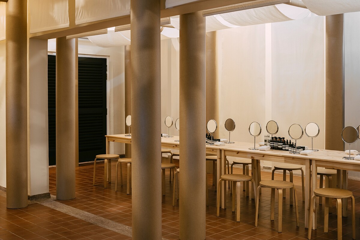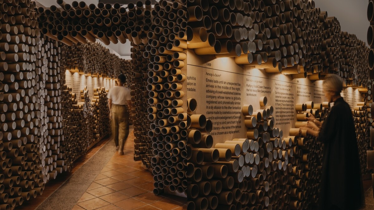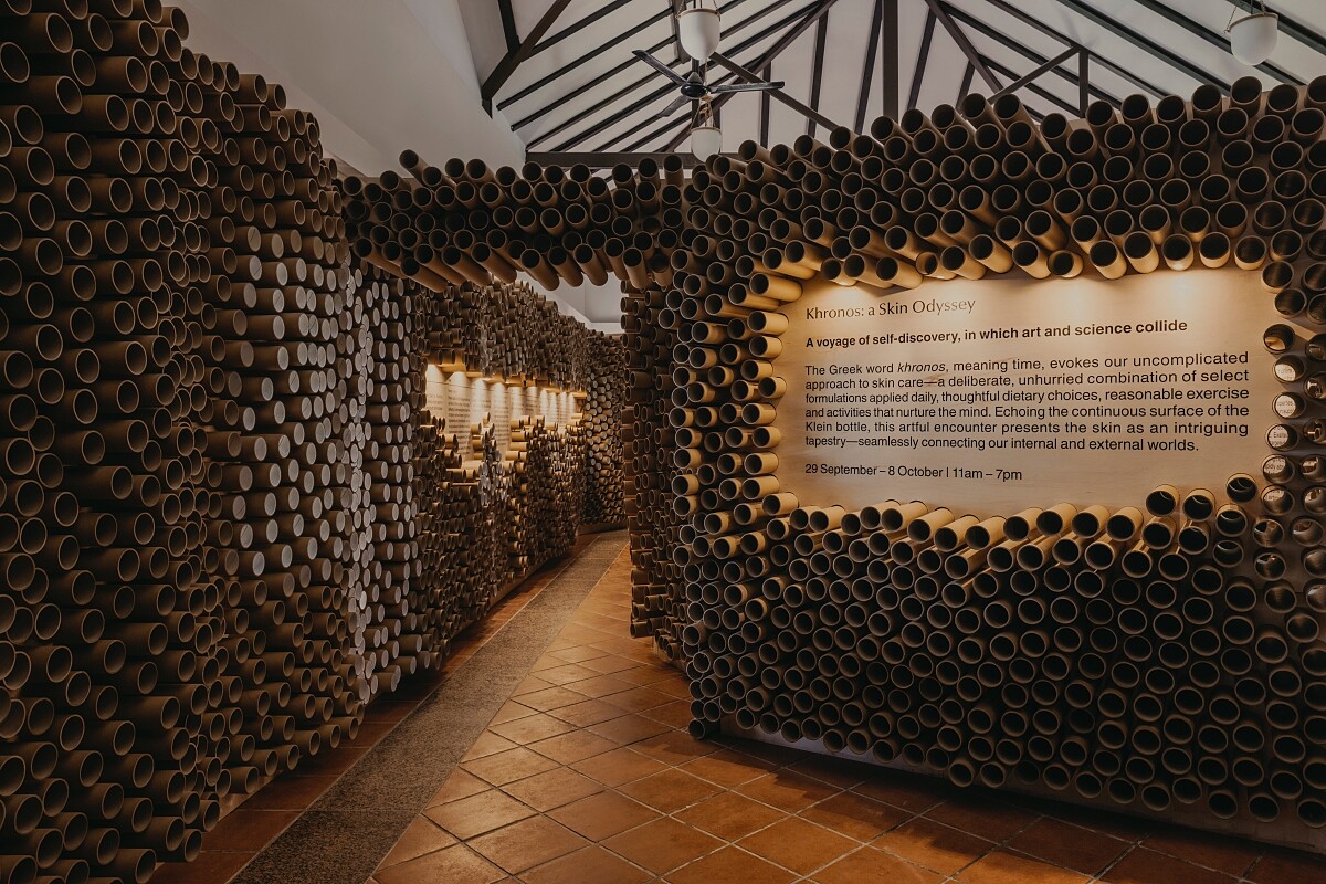 舉辦展覽和工作坊的地點,是被自然景觀和古蹟包圍的新加坡福康寧公園。萊佛士古樓內有著由紙筒組建而成的裝置設計,其樣貌和克萊因瓶(Klein bottle) 的連續表面巧妙呼應,就如同人體最大的器官:肌膚,亦是連續的起伏表面。在展覽空間中,除了能夠了解品牌關於護膚的核心理念、發展過程,也能在不同的空間氛圍中,親自體驗 Aēsop 的經典肌膚保養產品。