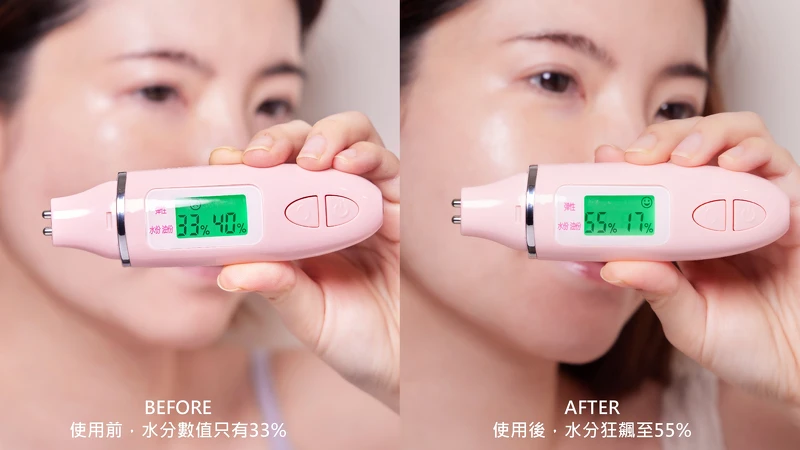 抹完後感受到指尖下的肌膚變得很細緻柔嫩,而且保濕續航力更是驚人,M編自己用保濕儀直接測試,水分數值整整+22%,整個飆升1.6倍,水潤感翻倍。